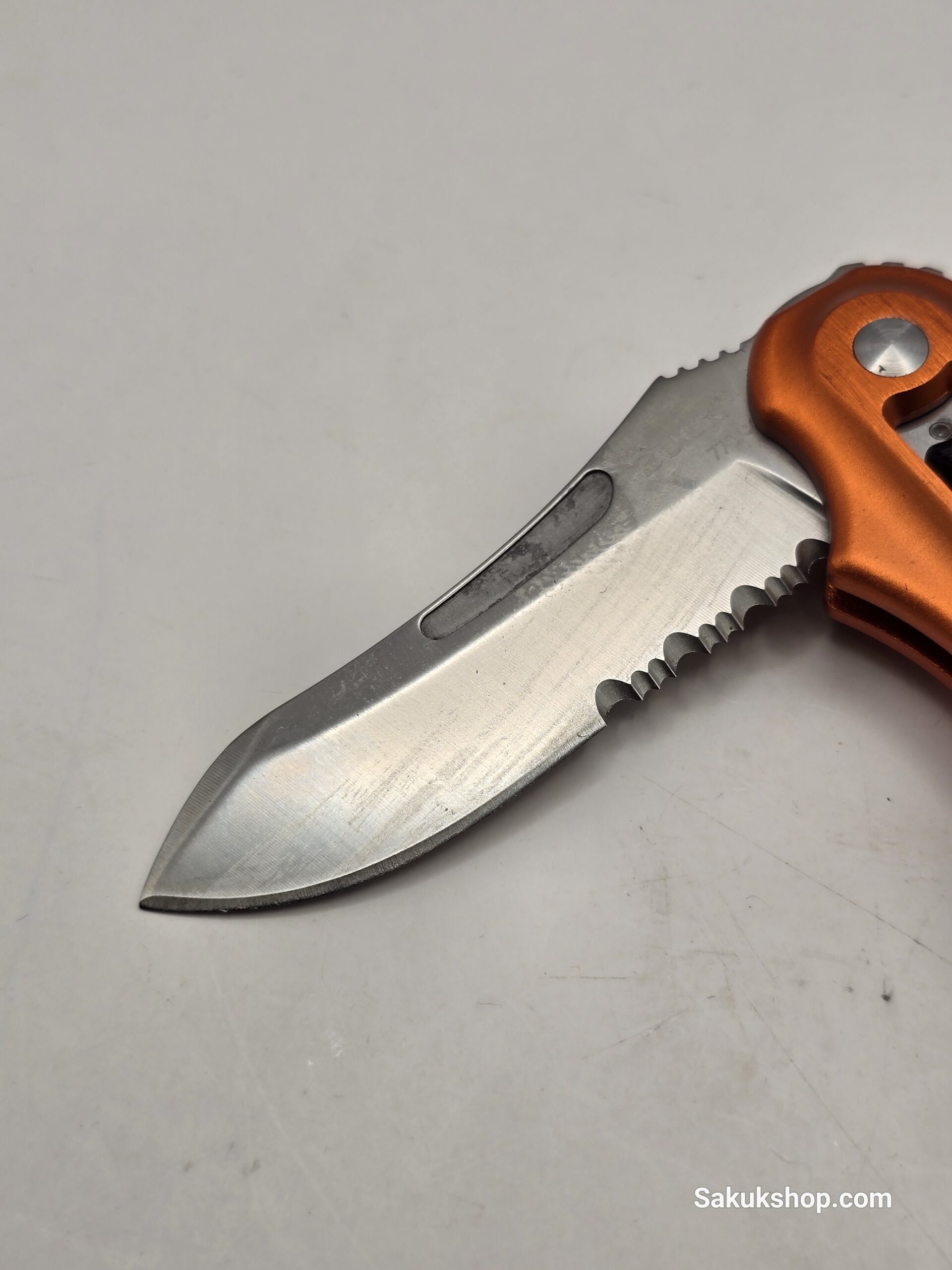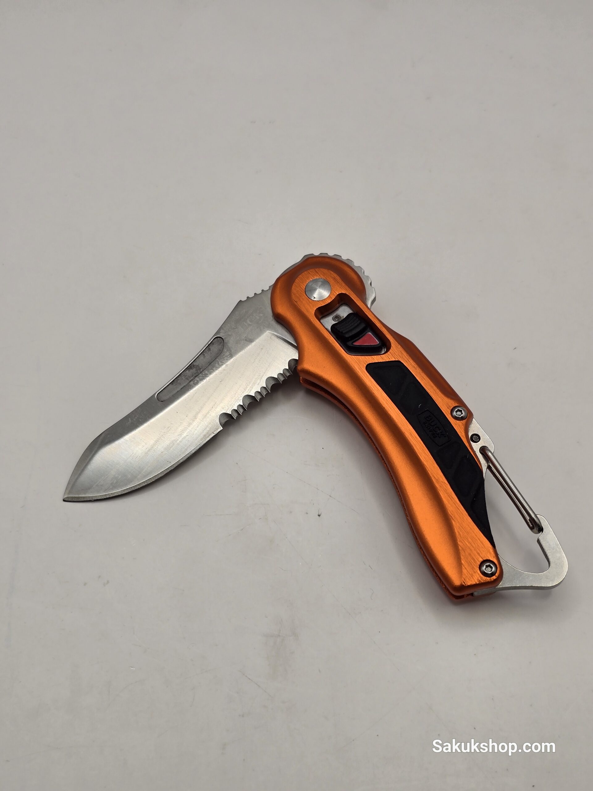 stainless steel blade, 6061-T6 aluminum handle with rubberized inlays, a built-in carabiner/bottle opener, and a unique SafeSpin button-lock mechanism for one-handed, safe operation.