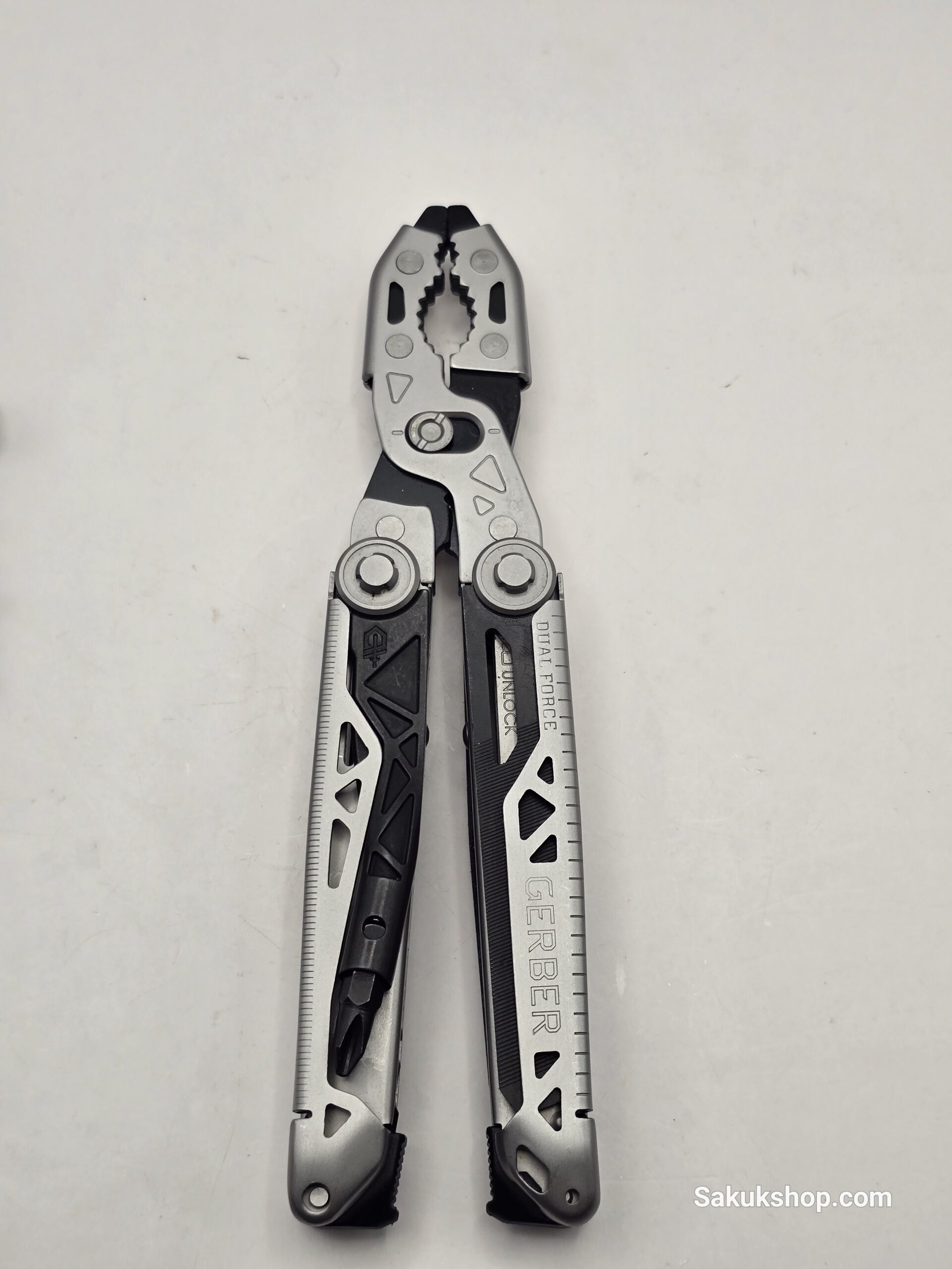The Gerber Dual-Force is a heavy-duty multi-tool designed for high-torque tasks, featuring adjustable 2-position slip-joint pliers with extra-large teeth. It includes a centered, full-size magnetic bit driver for maximum control and a layered construction for enhanced strength. Key tools include a plain-edge blade, saw, file, wire cutters/stripper, and additional bit