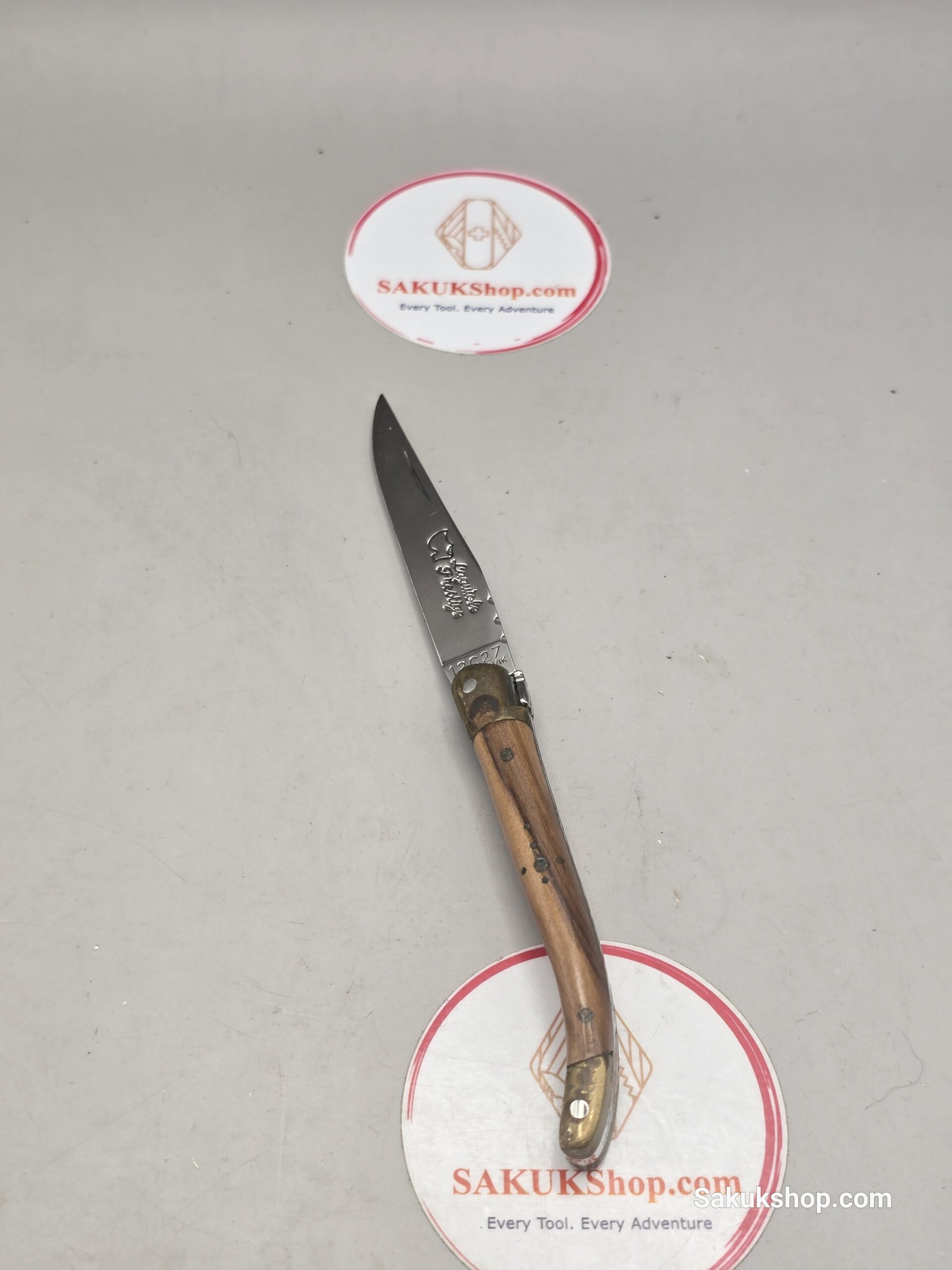 - Mechanism: A ribbed lever at the butt of the handle releases the blade, which slides out, opens, and then pushes back into the handle to lock.