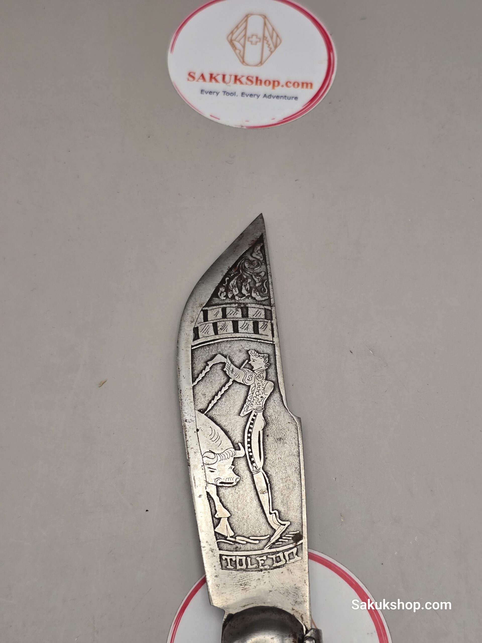 This is a vintage folding pocket knife, traditionally known as a navaja, crafted in Toledo, Spain. It is a distinctive piece that blends classic Spanish design with the formidable profile of a Bowie knife