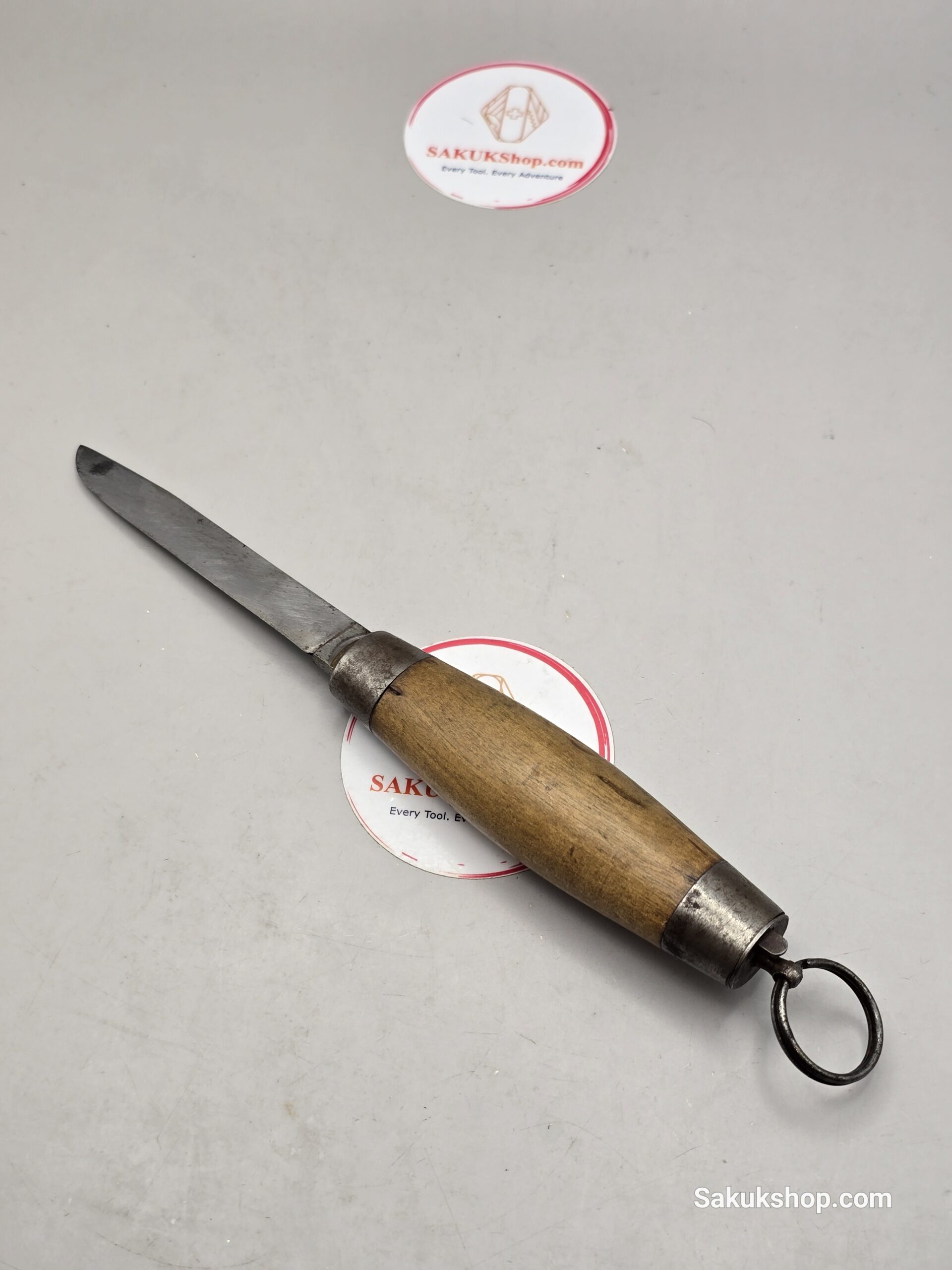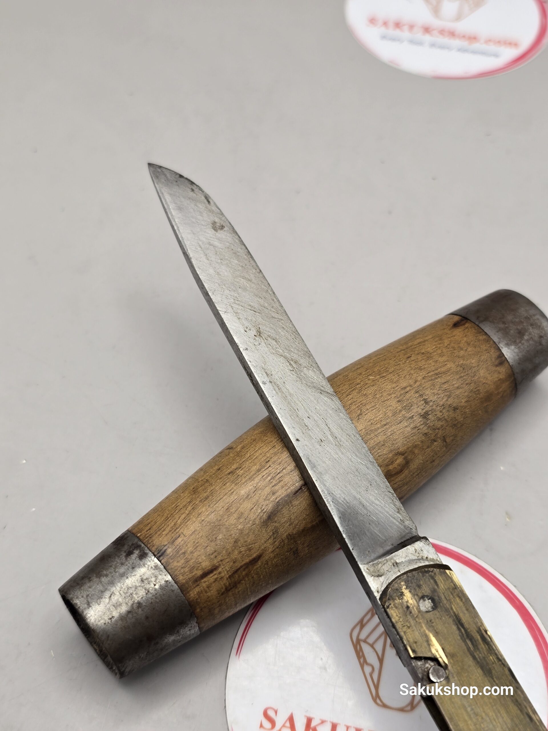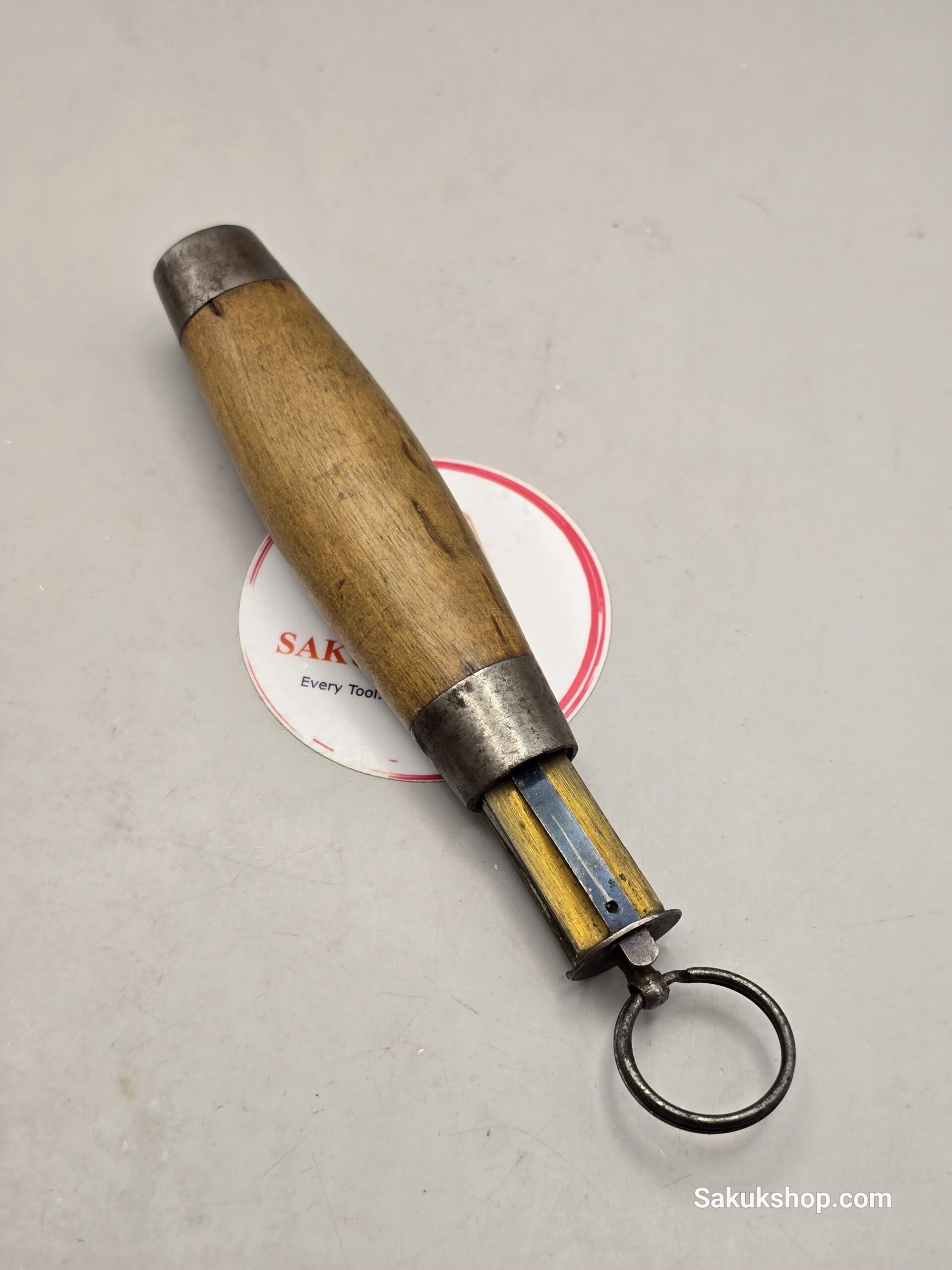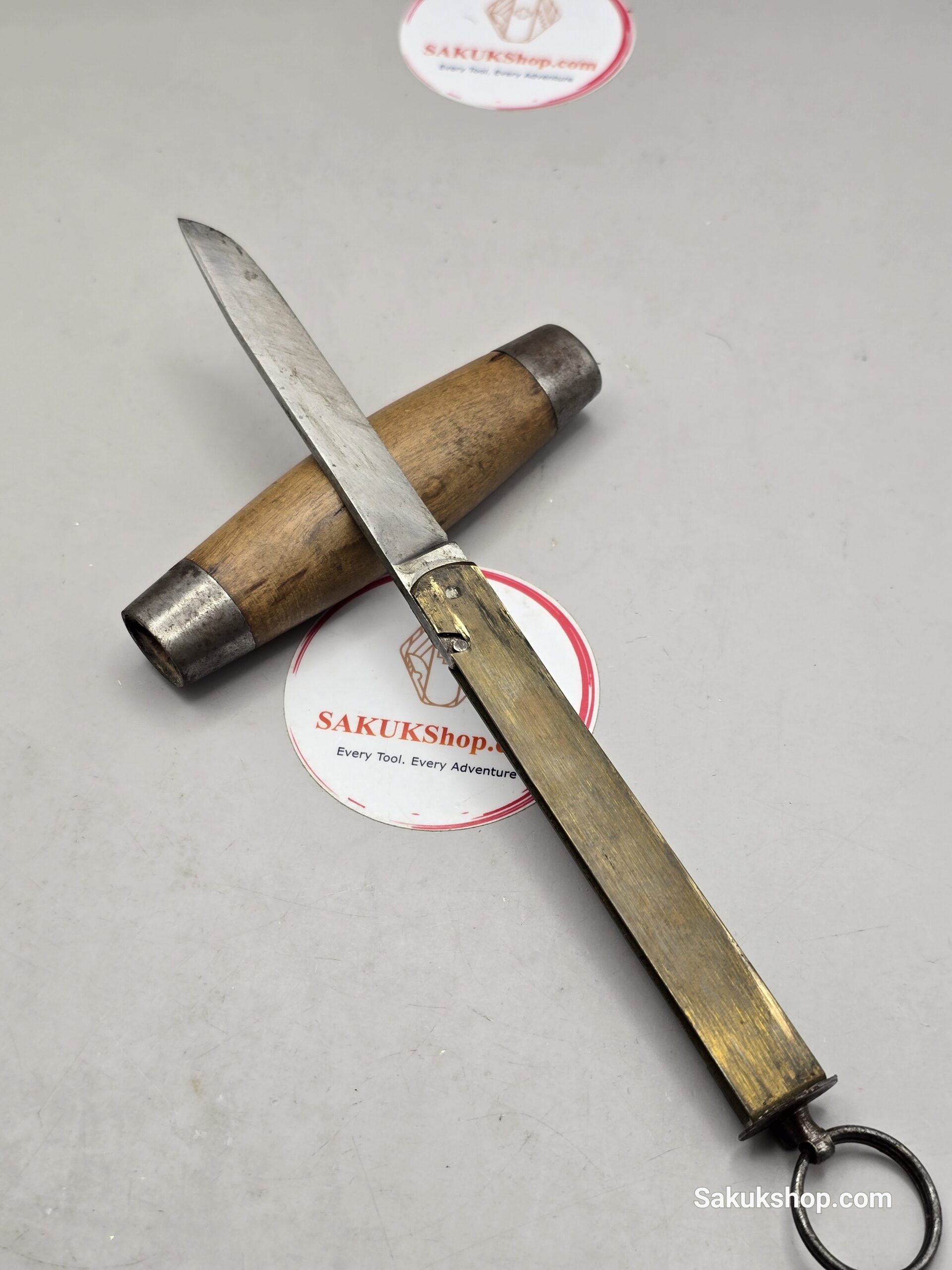 Design: The blade is housed within the handle, often a wooden barrel (like curly birch) or brass sleeve.