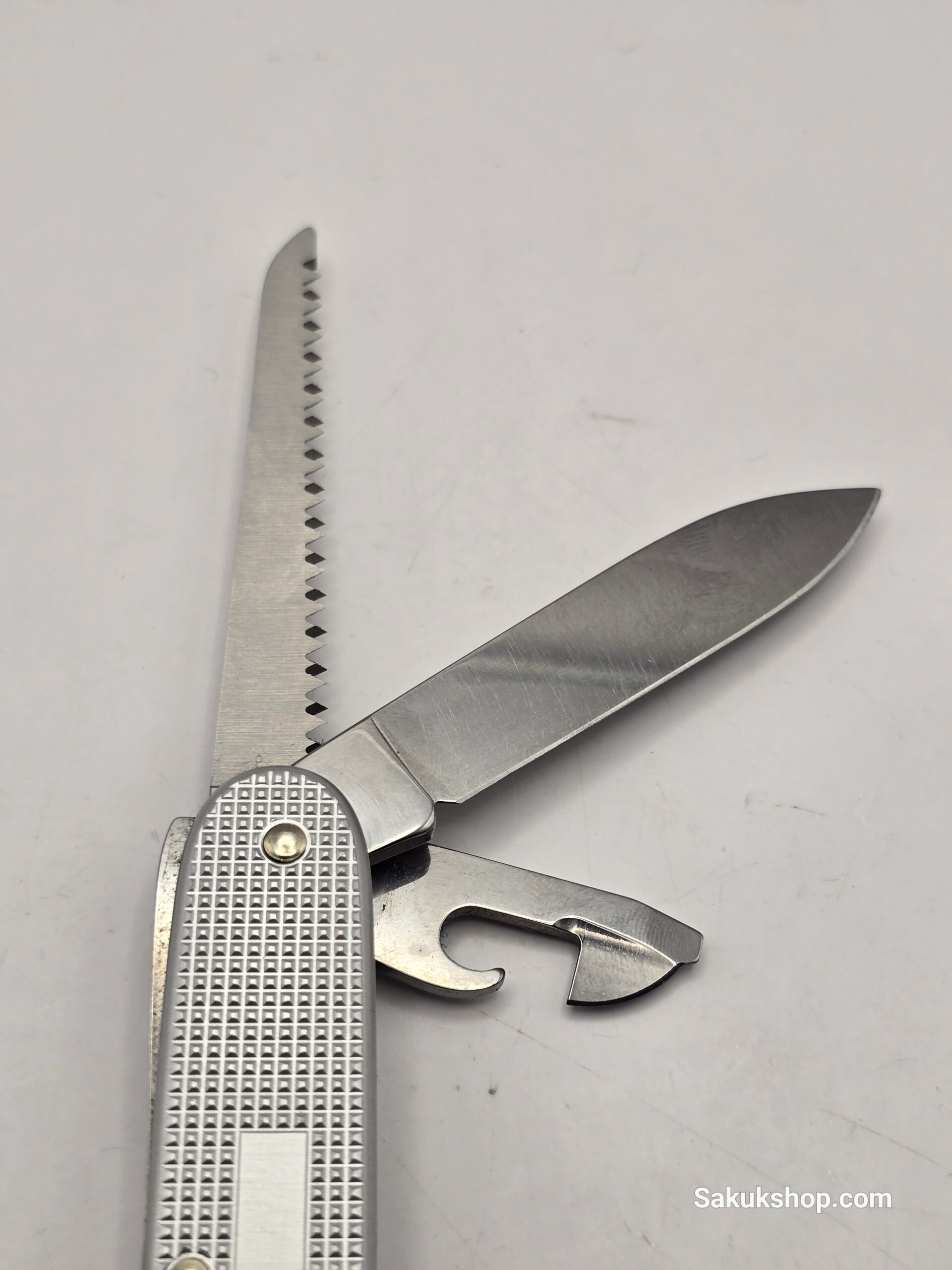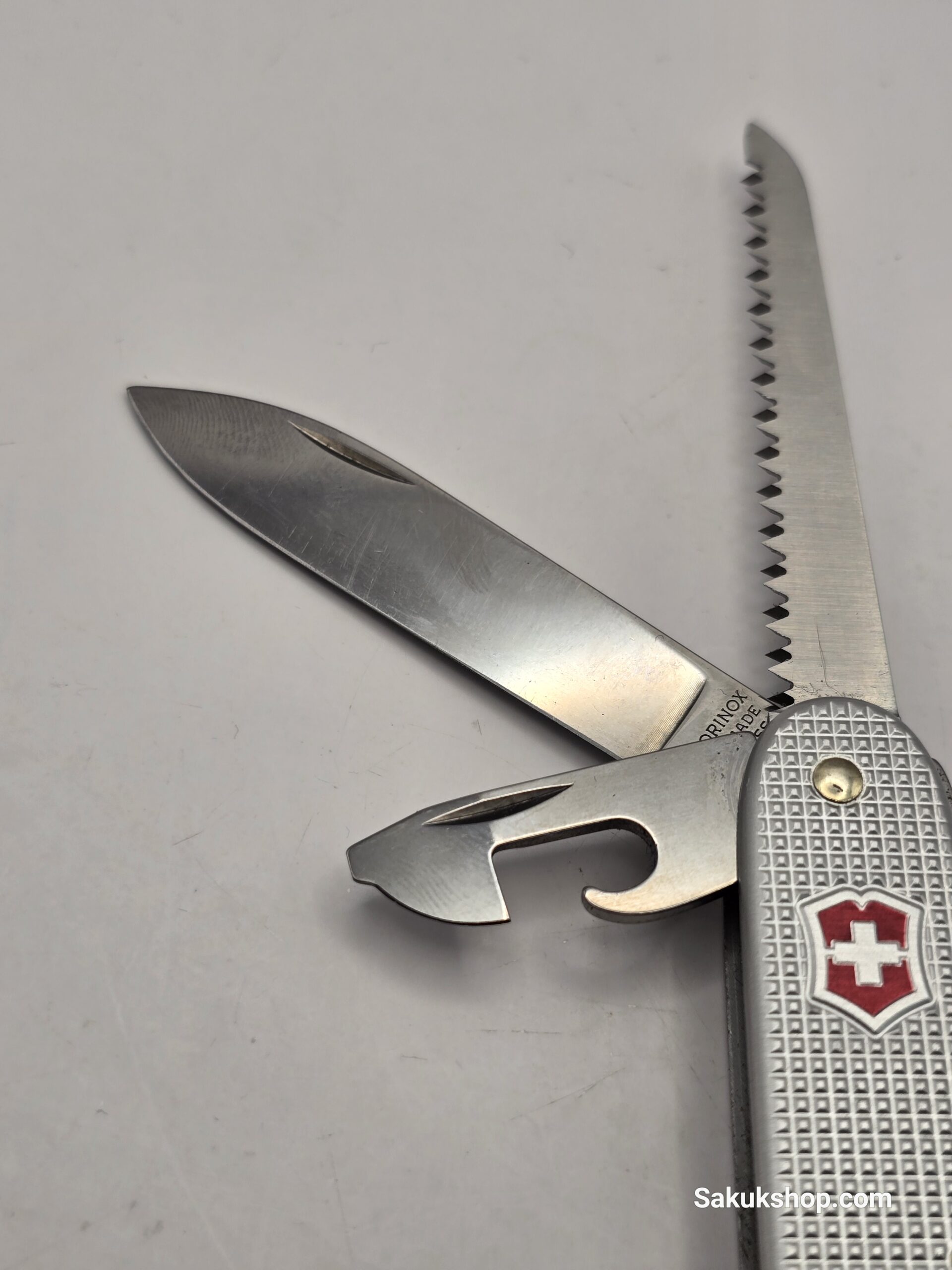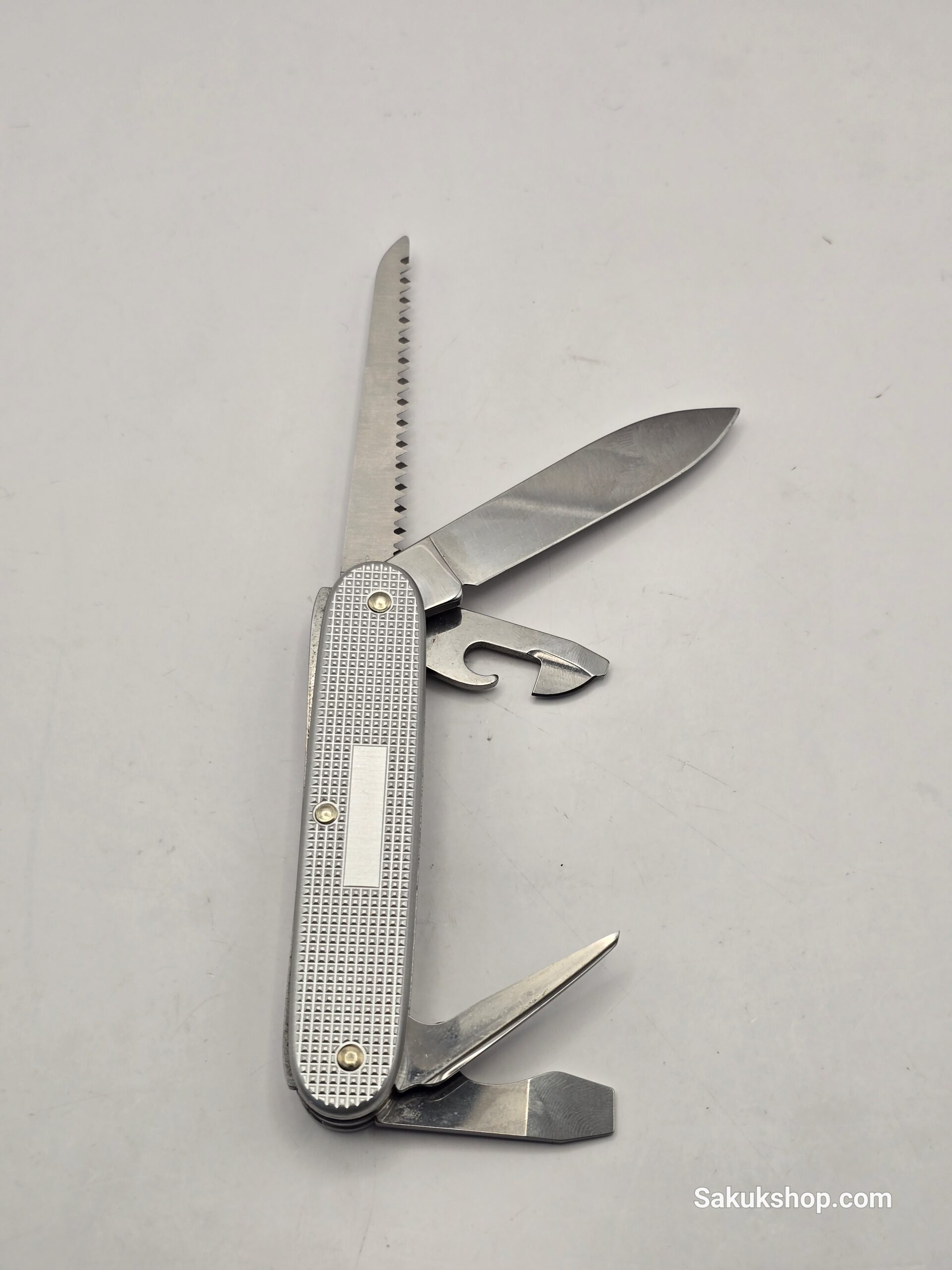 The Victorinox Alox Farmer is a 93mm (3.66-inch) multi-tool known for its durable, ribbed anodized aluminum scales and robust construction, often considered a step up from the standard Pioneer model due to the addition of a wood saw. While many modern versions include a key ring, a “no keyring” version exists, sometimes identified with special, limited-run models or earlier variations.