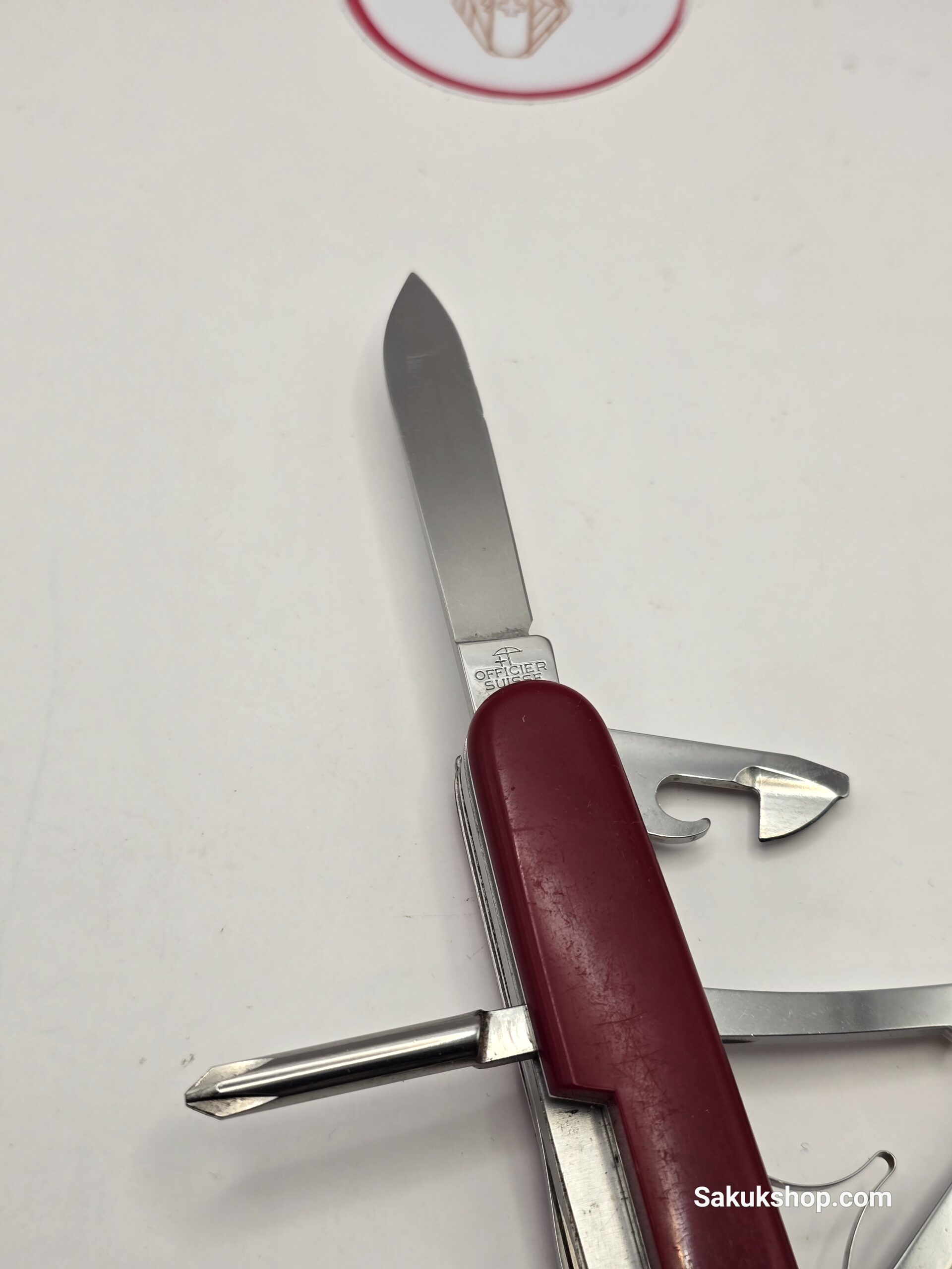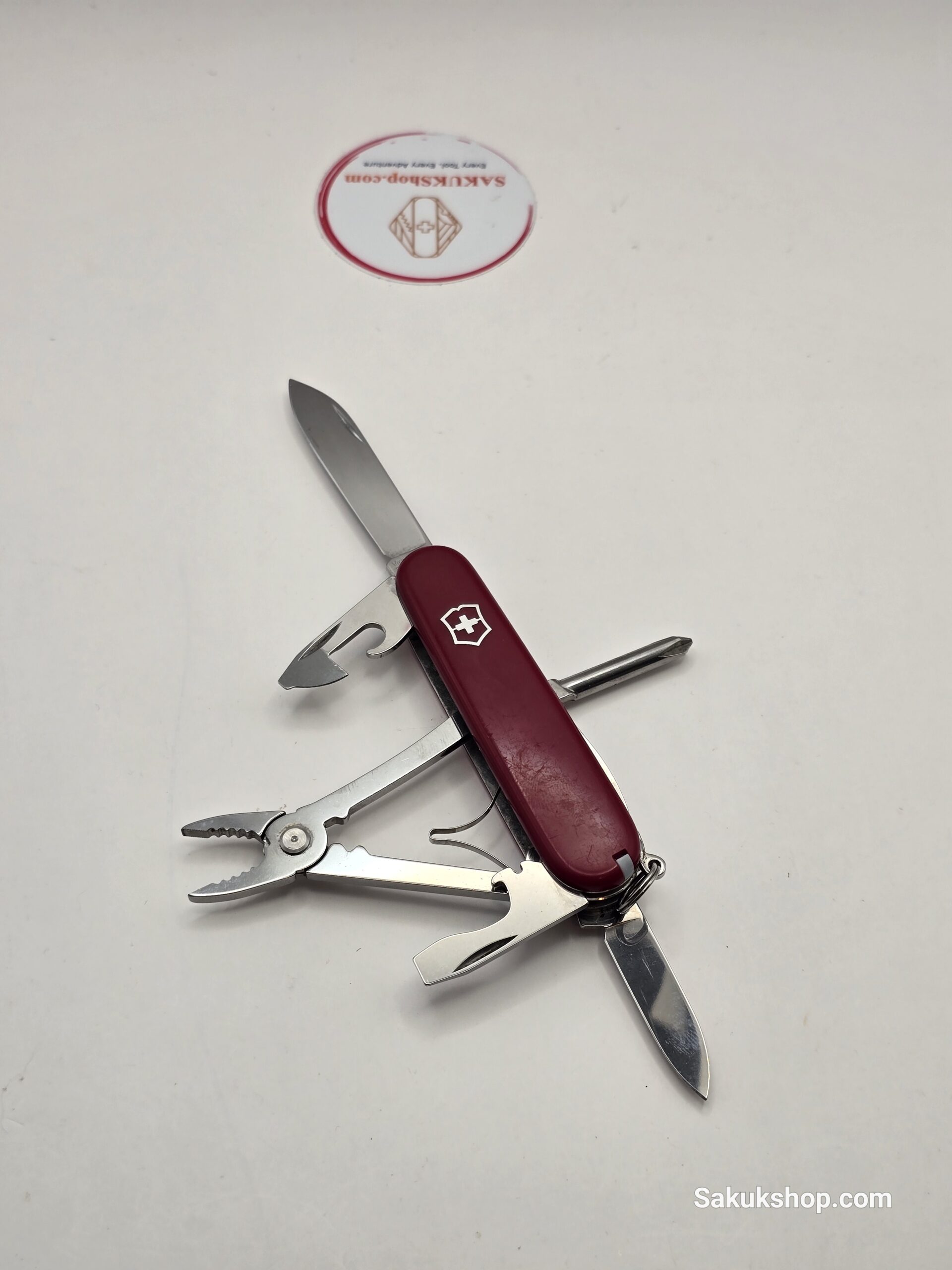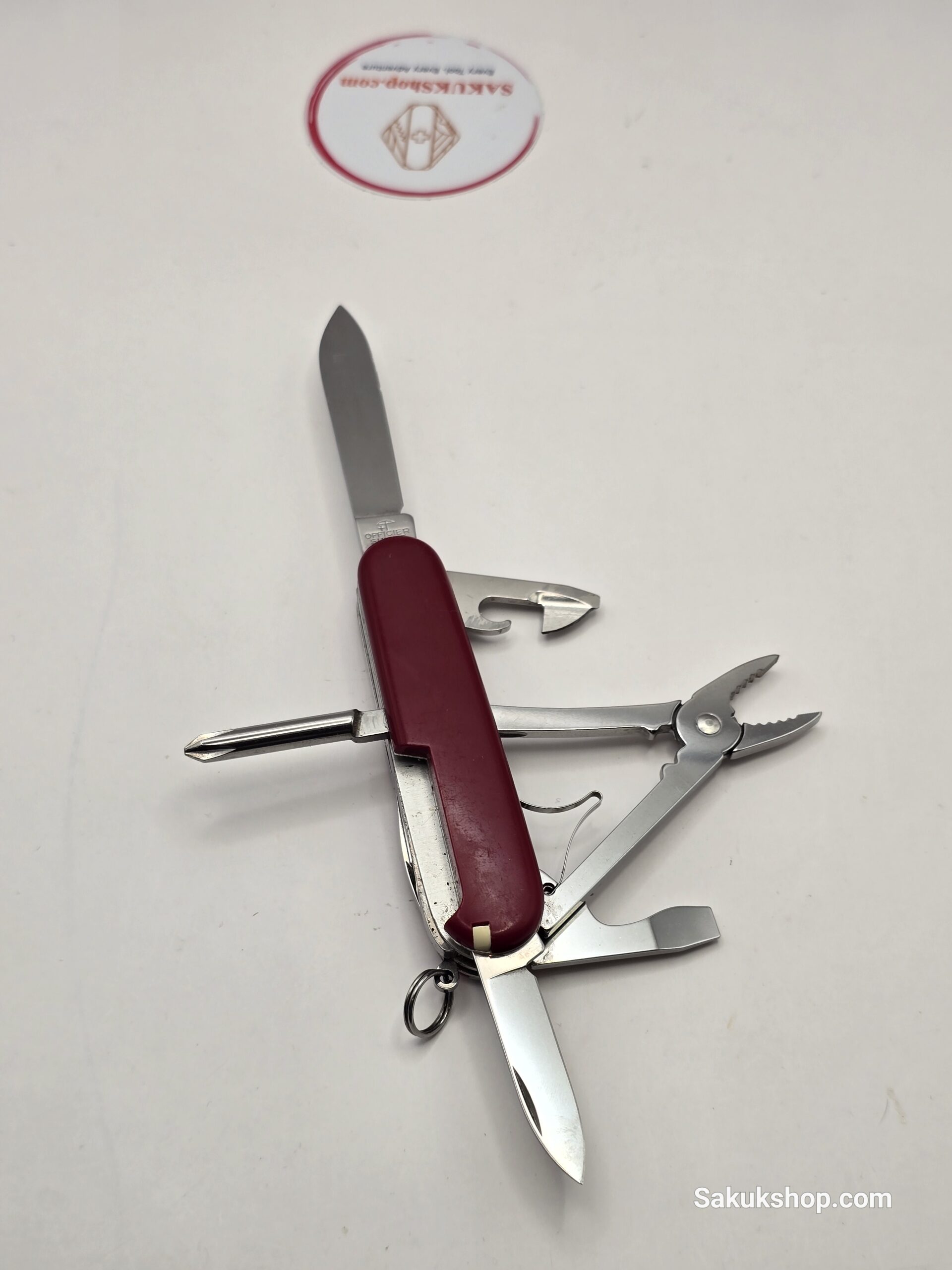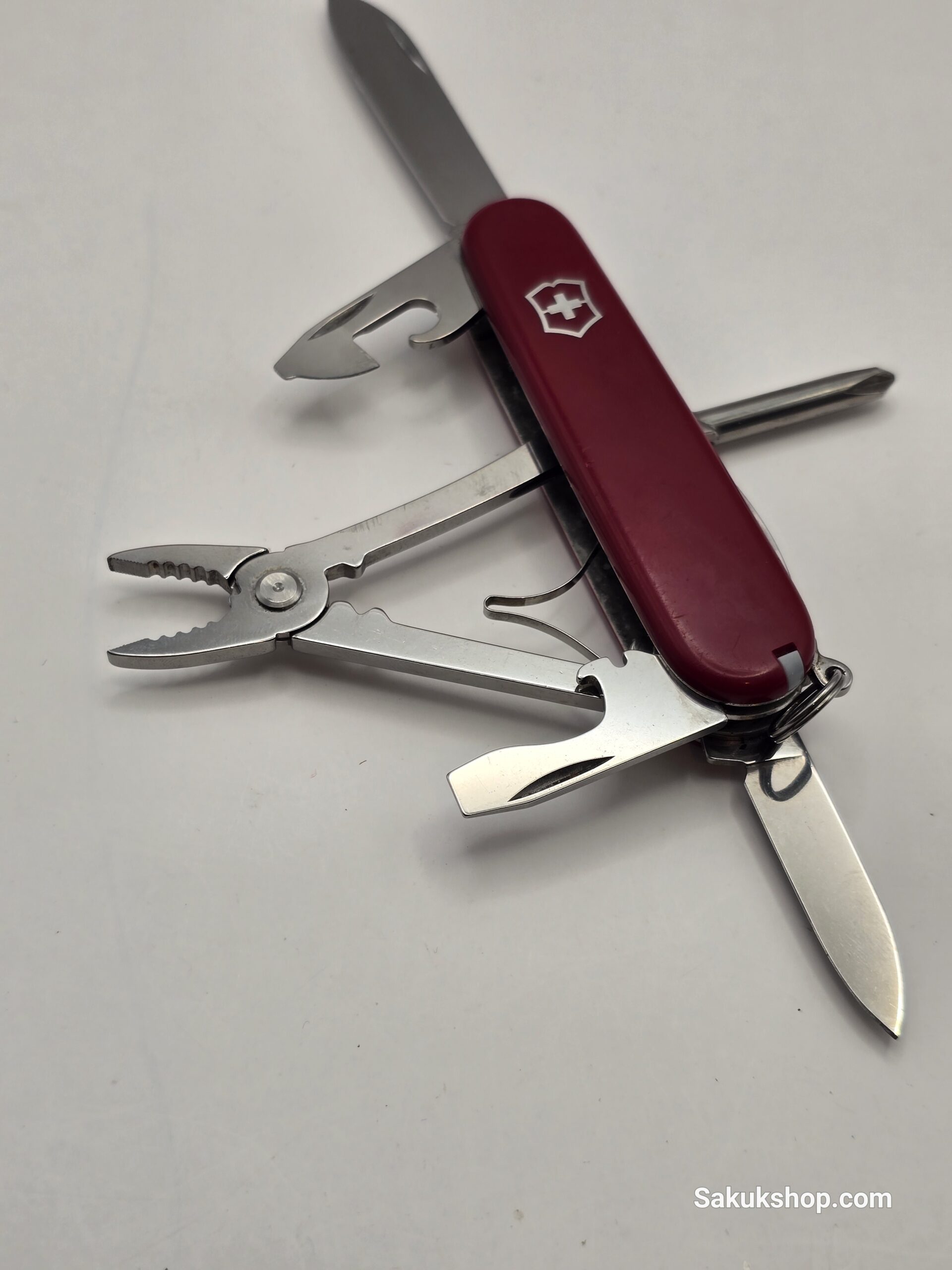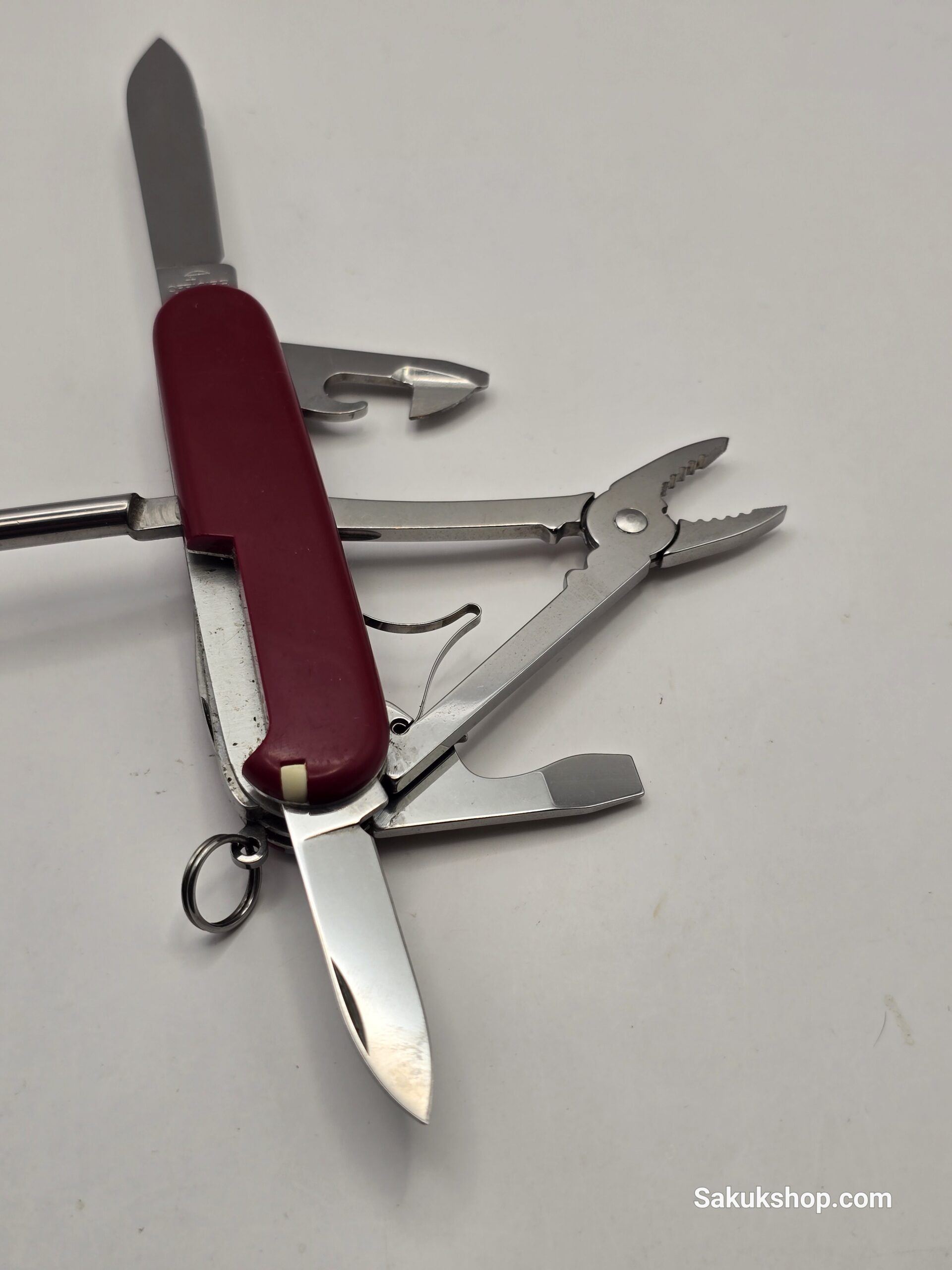 Main Tools: Large blade, small blade, pliers, can opener (with small screwdriver), bottle opener (with large screwdriver & wire stripper), awl, tweezers, toothpick.