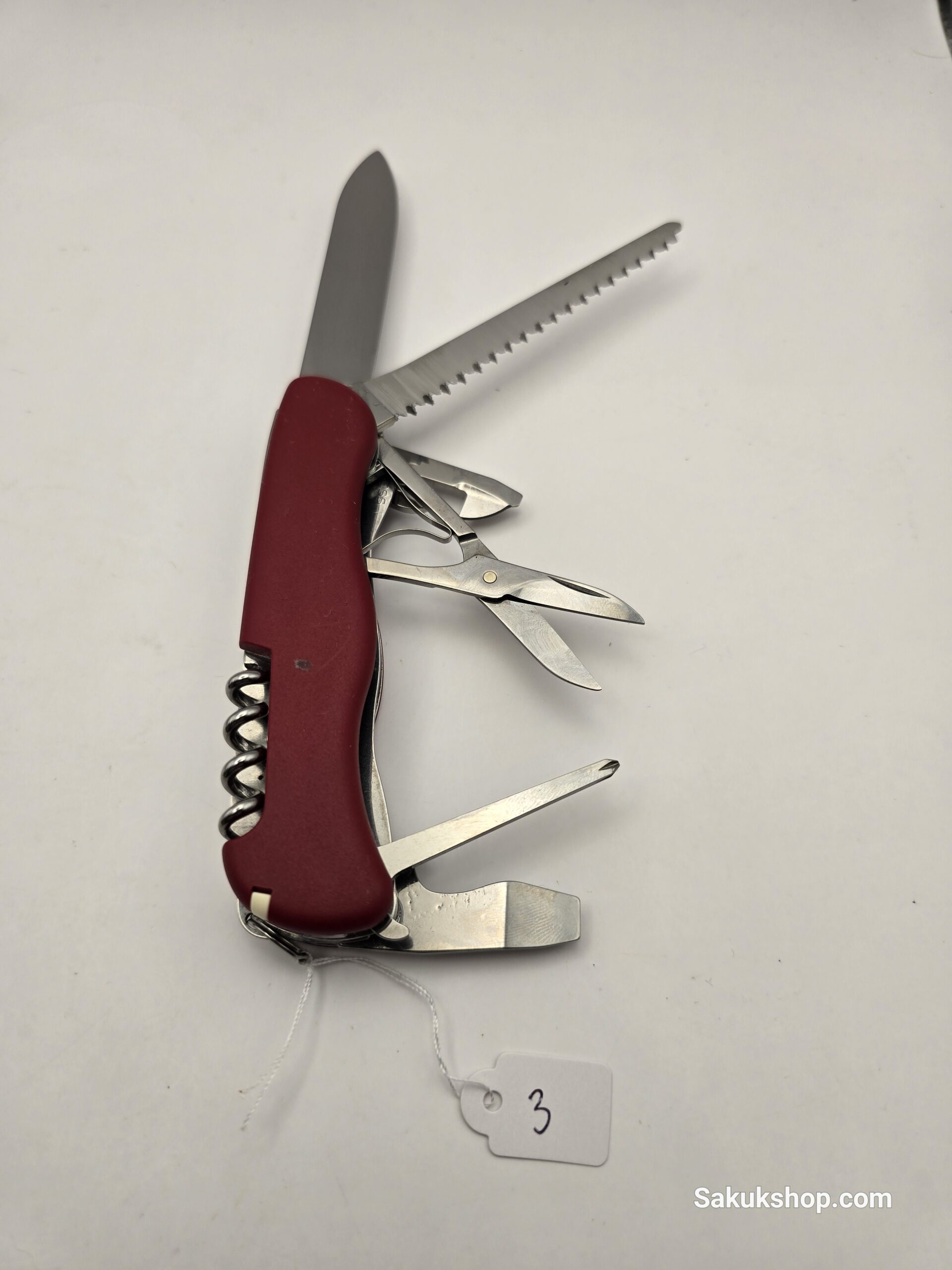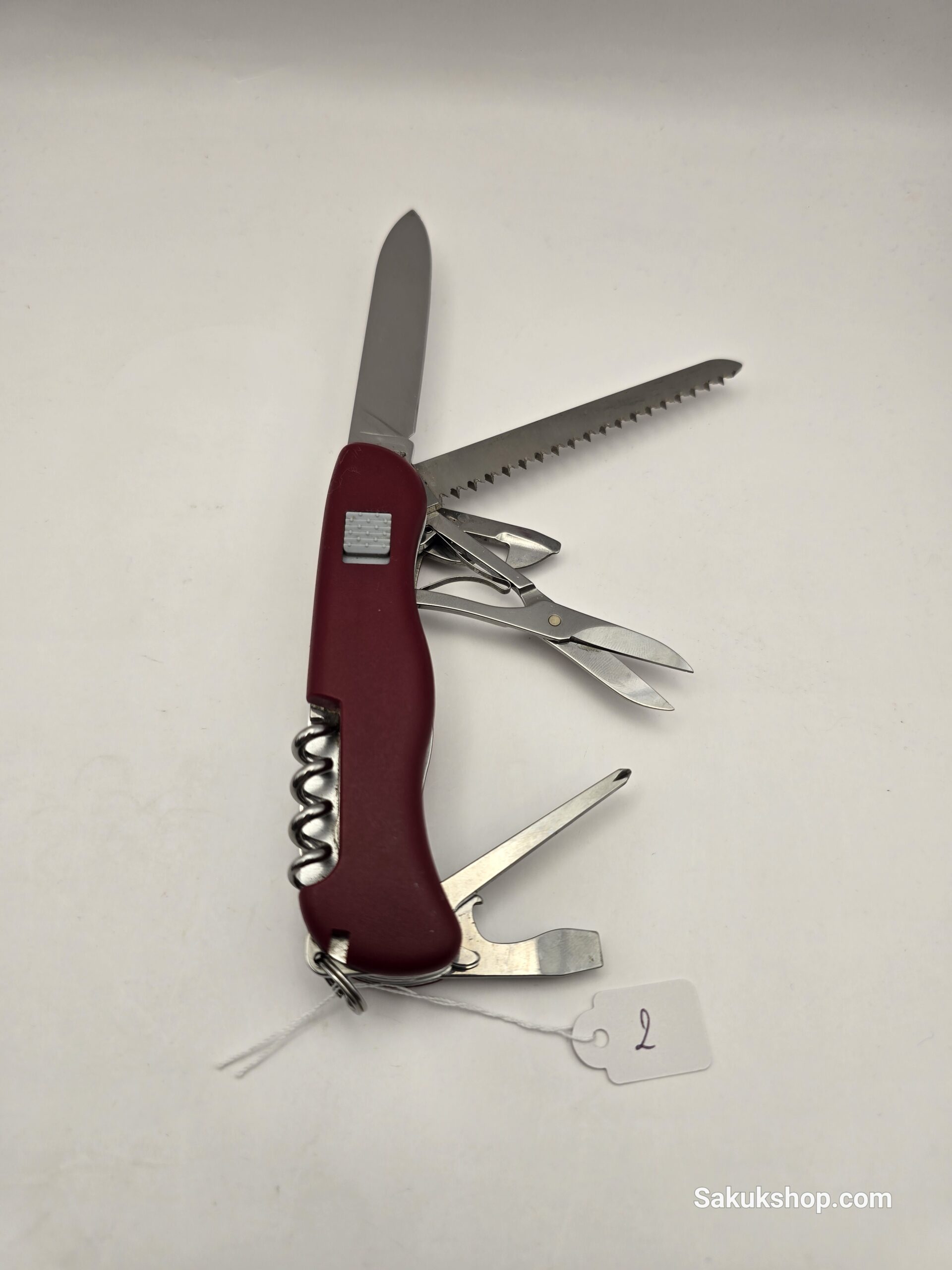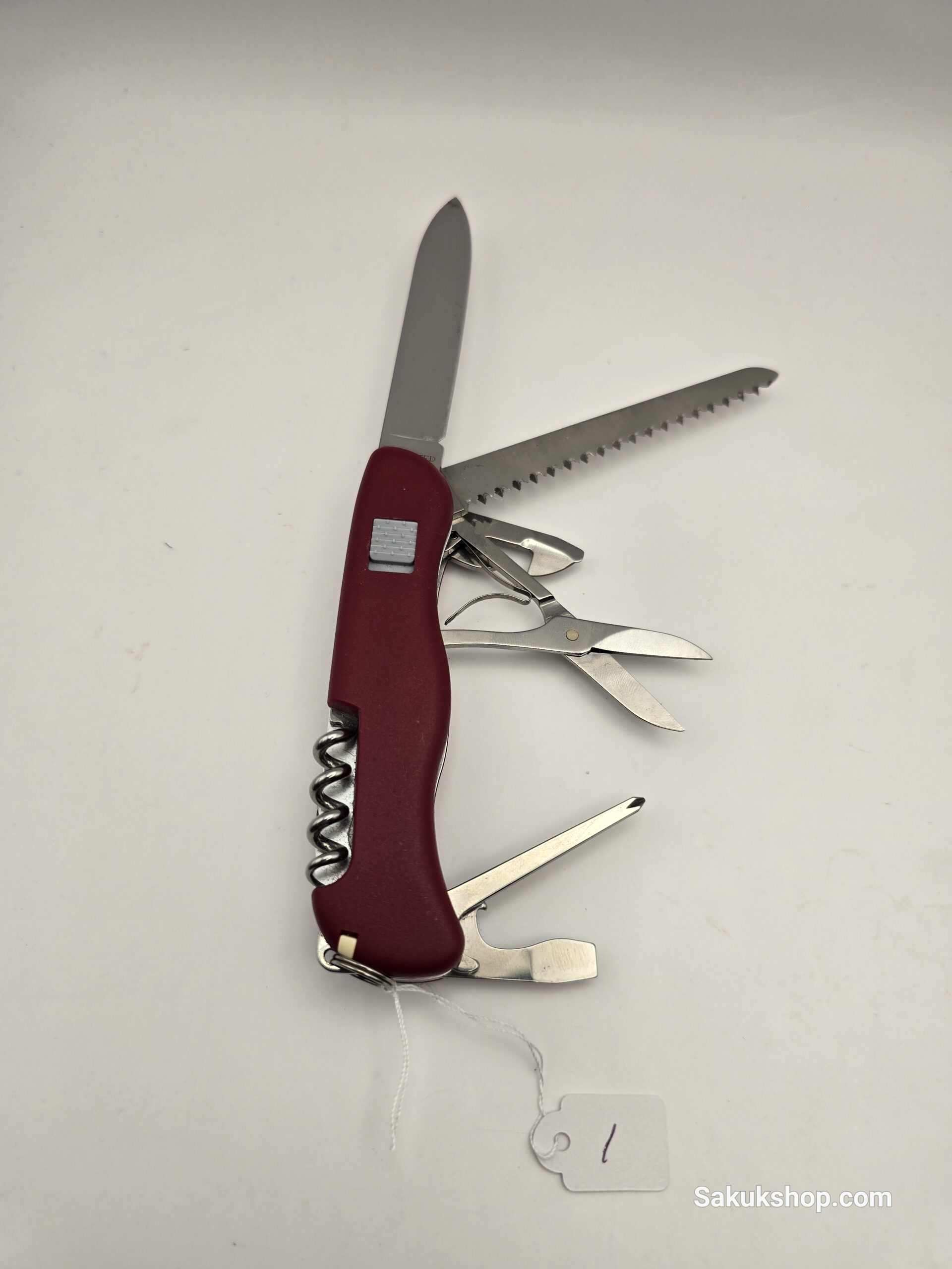 14 Functions: Includes a locking large blade, wood saw, scissors, long Phillips screwdriver, bottle opener (lockable), screwdriver 7mm, wire stripper, can opener, small screwdriver 3mm, reamer/punch, corkscrew, key ring, tweezers, and toothpick.
