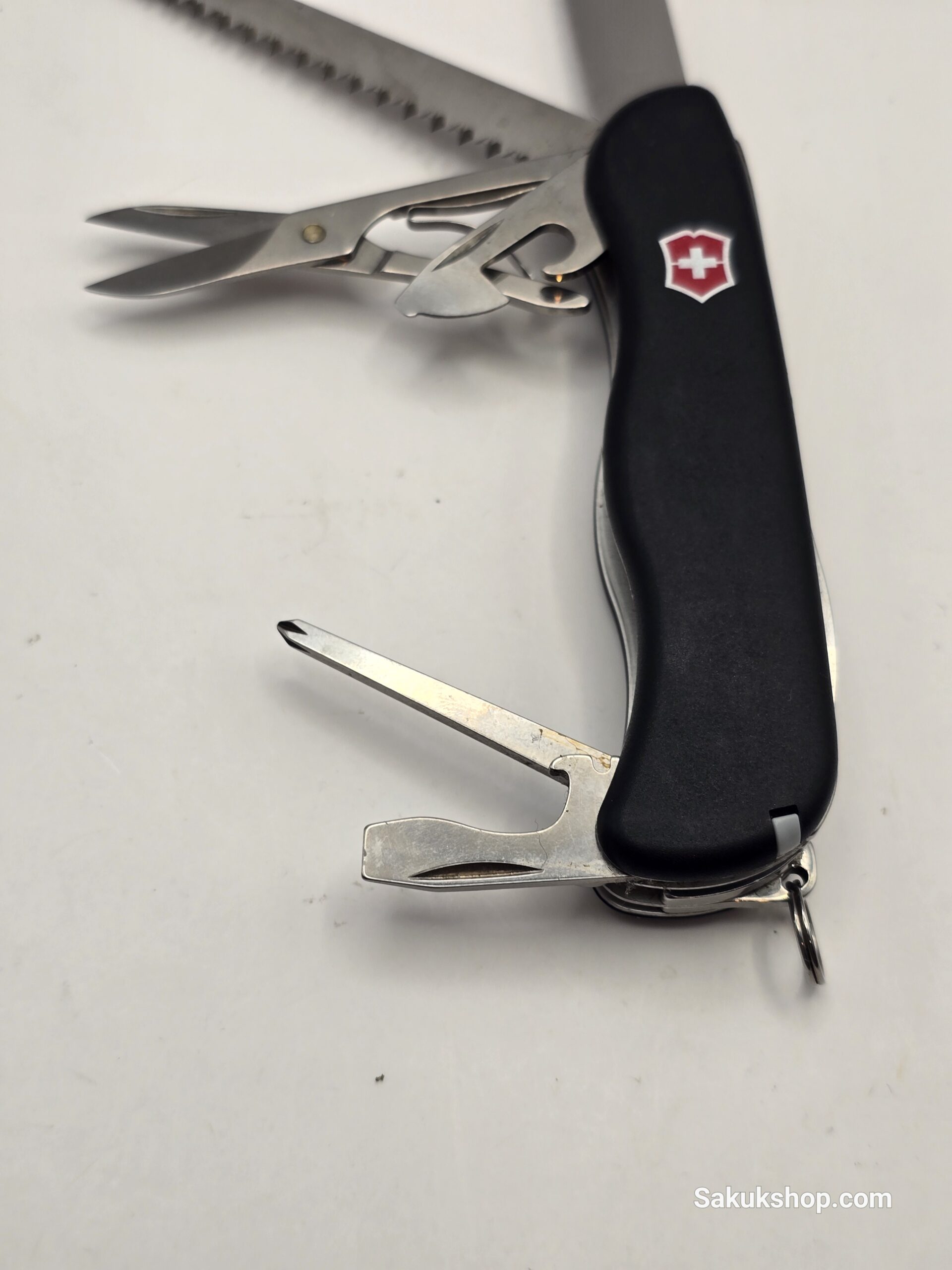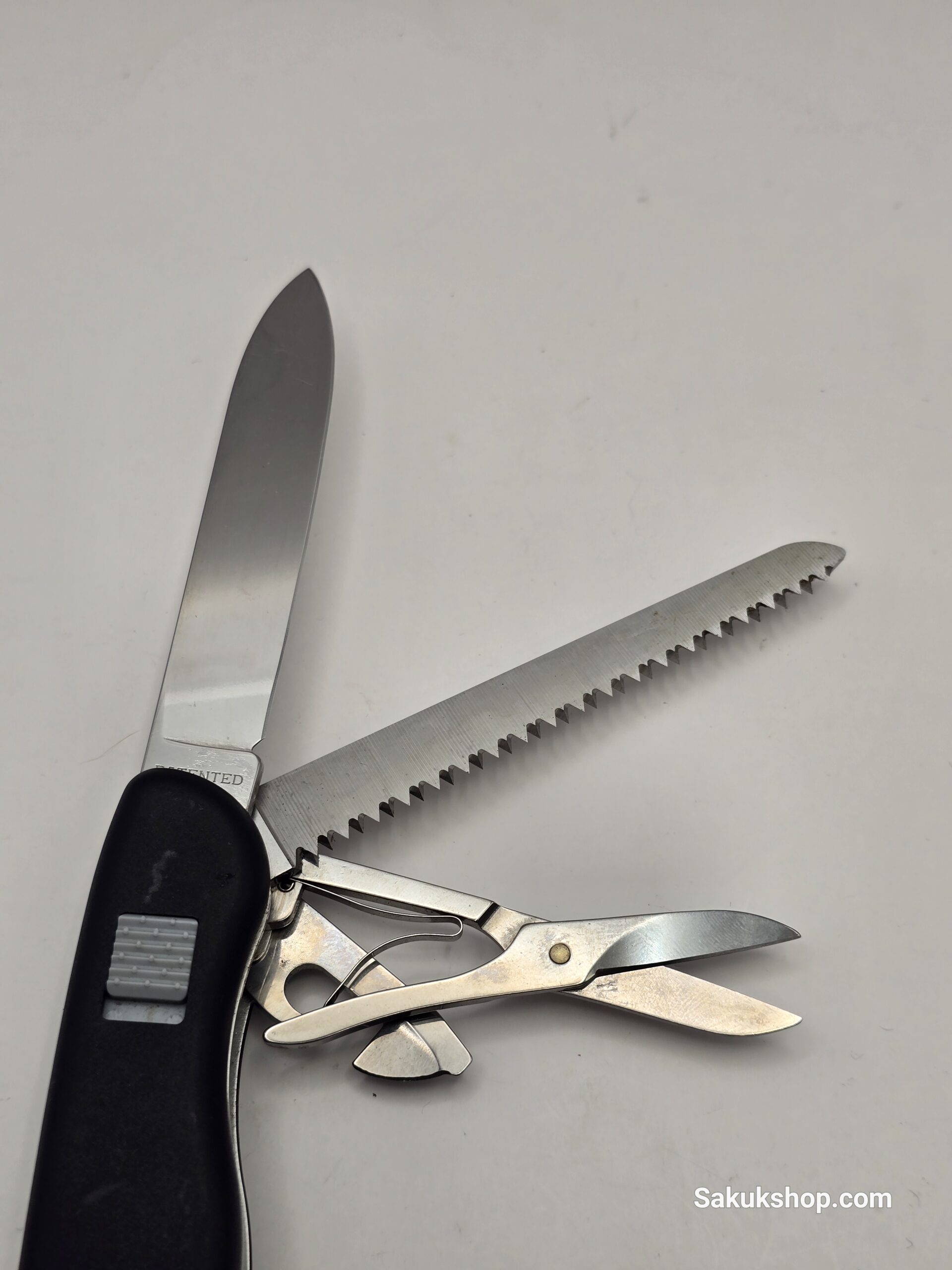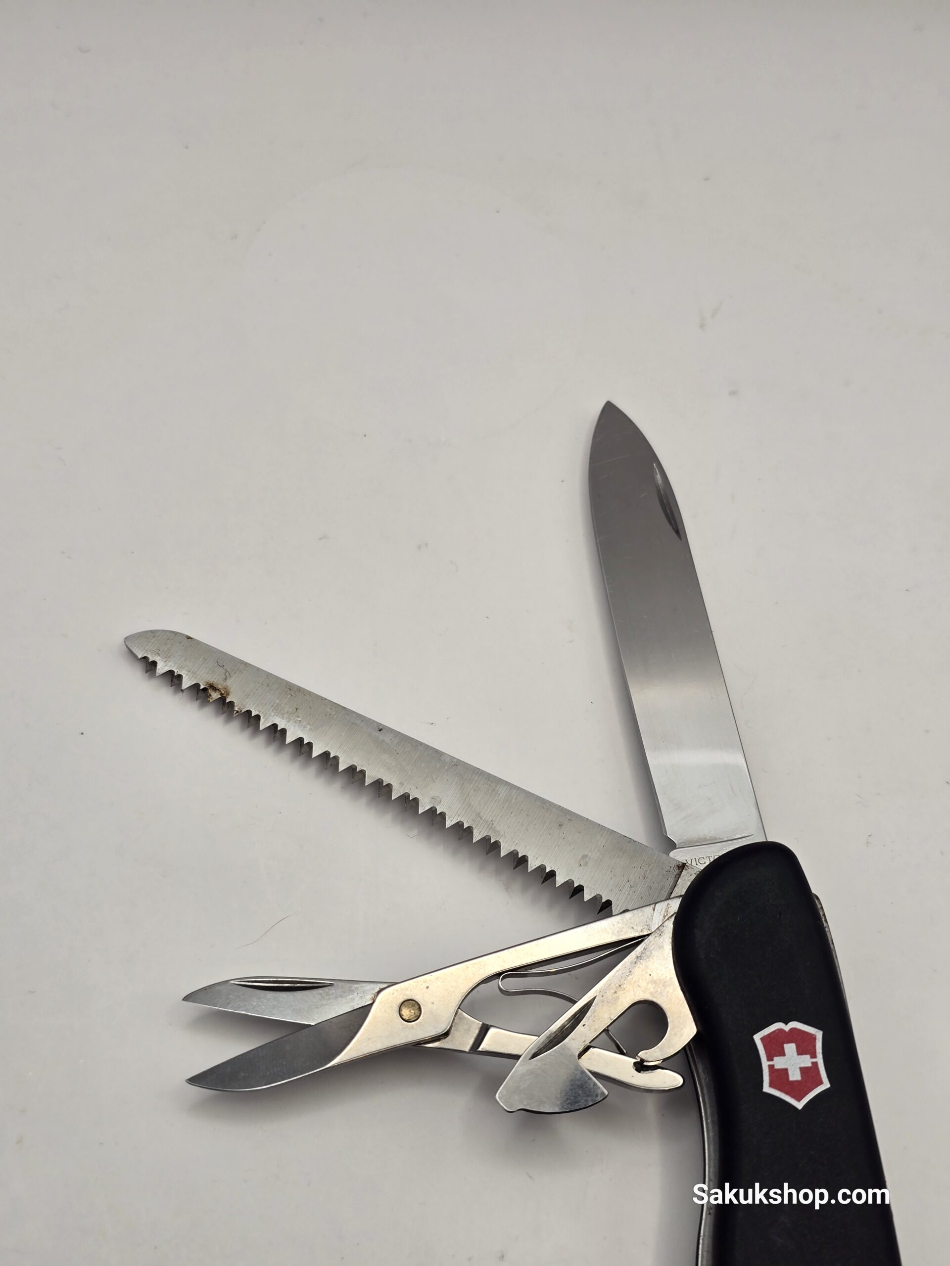 The Victorinox Outrider uses a liner lock system for its large blade, featuring a prominent, easy-to-press tab on the side of the handle that you push to release the blade for closing, providing enhanced safety and preventing accidental closure during use, a common feature on its larger 111mm models. This design allows for one-handed opening and closing and distinguishes it from smaller Swiss Army Knives, making it more robust for outdoor tasks like wood cutting with its saw.
