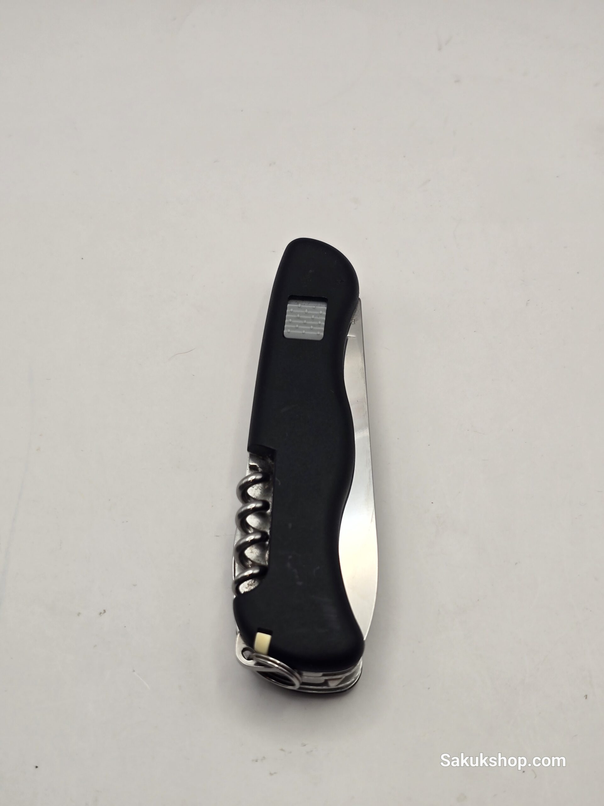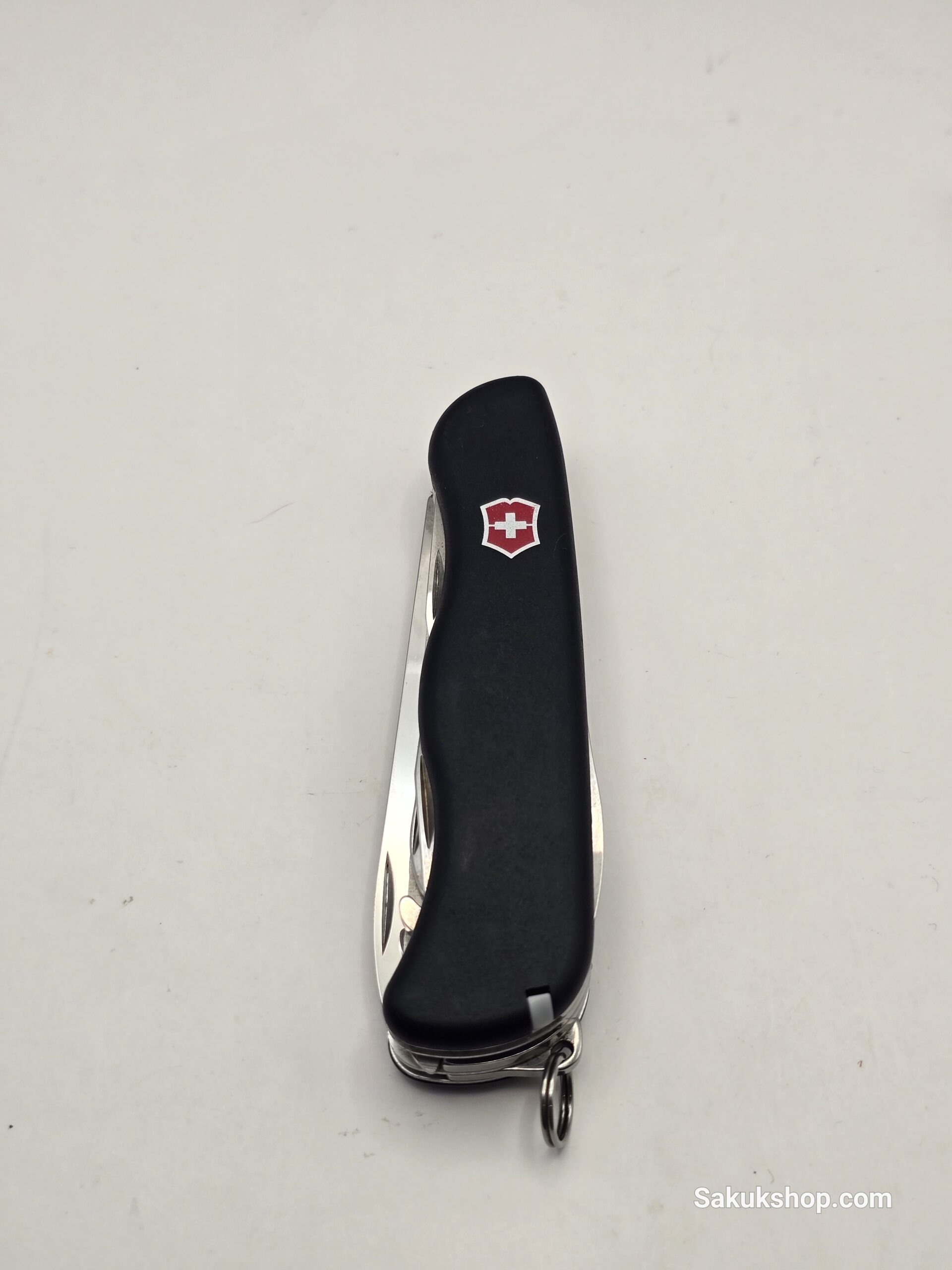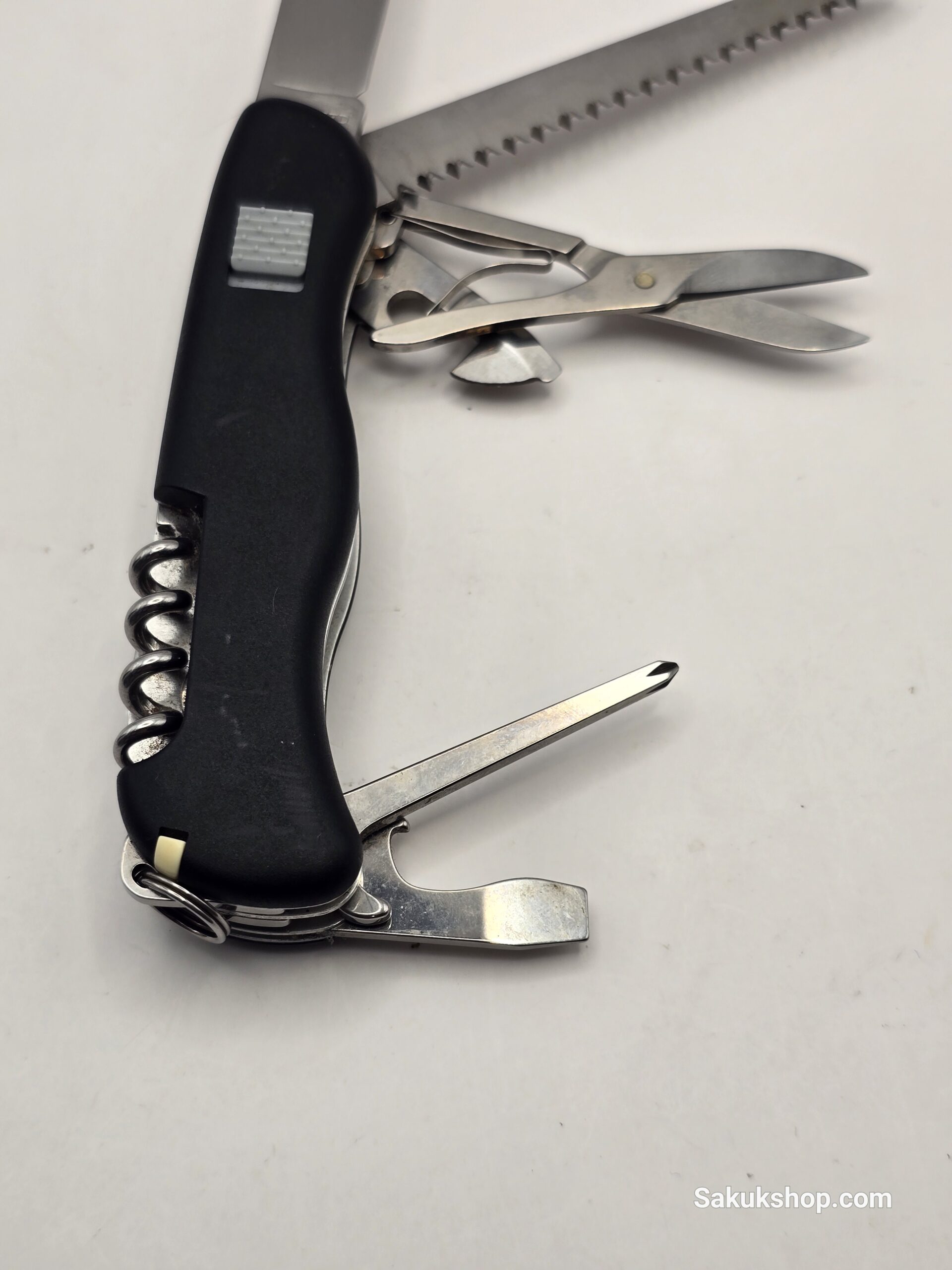 The Victorinox Outrider uses a liner lock system for its large blade, featuring a prominent, easy-to-press tab on the side of the handle that you push to release the blade for closing, providing enhanced safety and preventing accidental closure during use, a common feature on its larger 111mm models. This design allows for one-handed opening and closing and distinguishes it from smaller Swiss Army Knives, making it more robust for outdoor tasks like wood cutting with its saw.