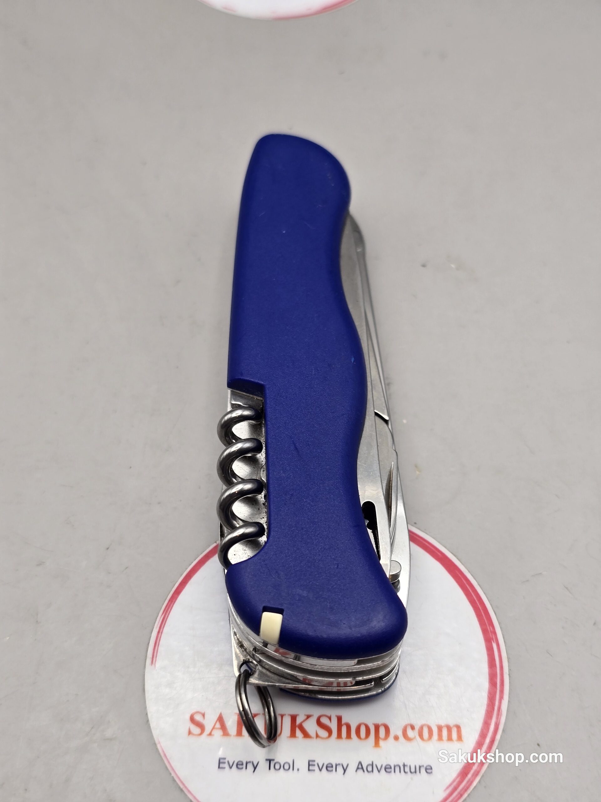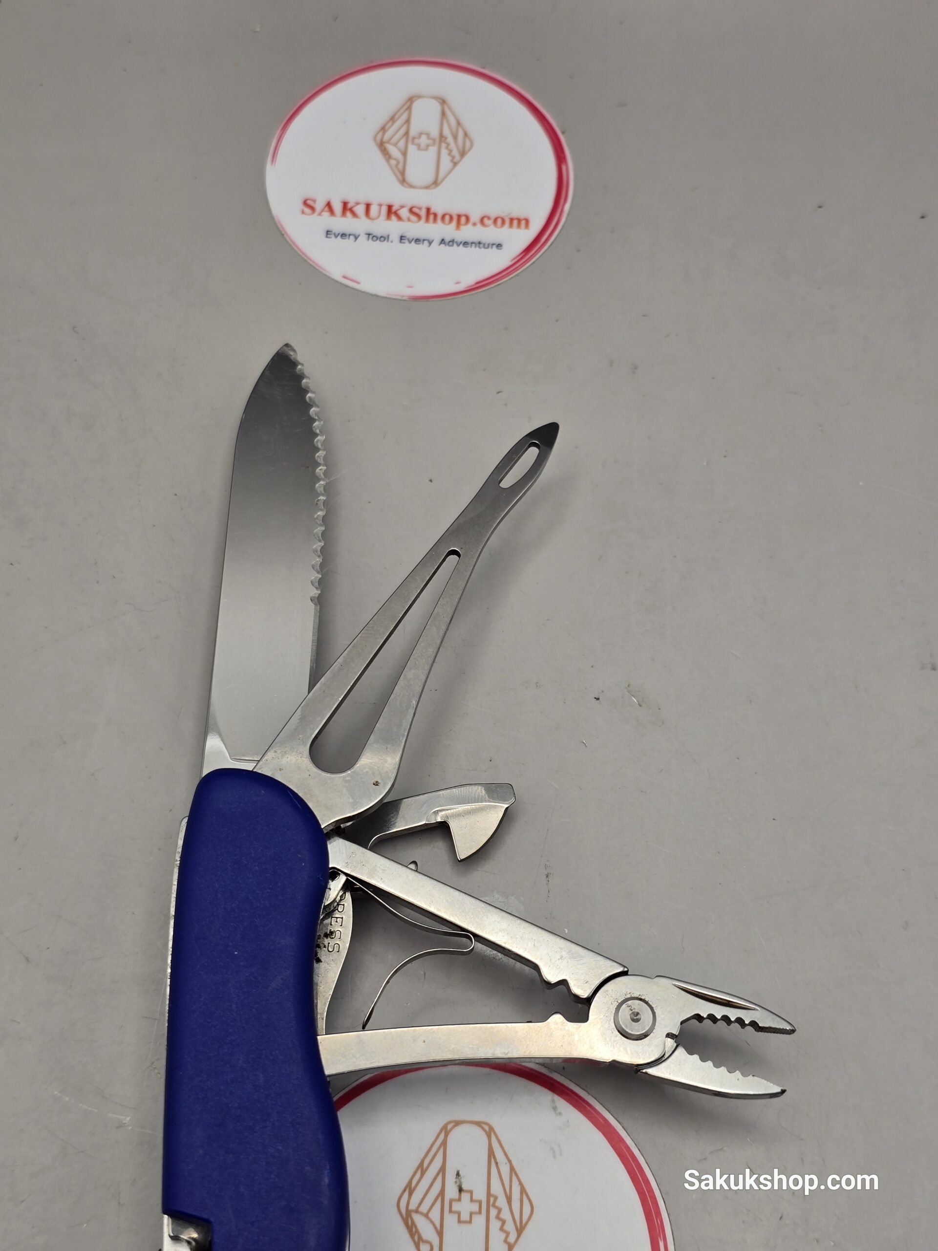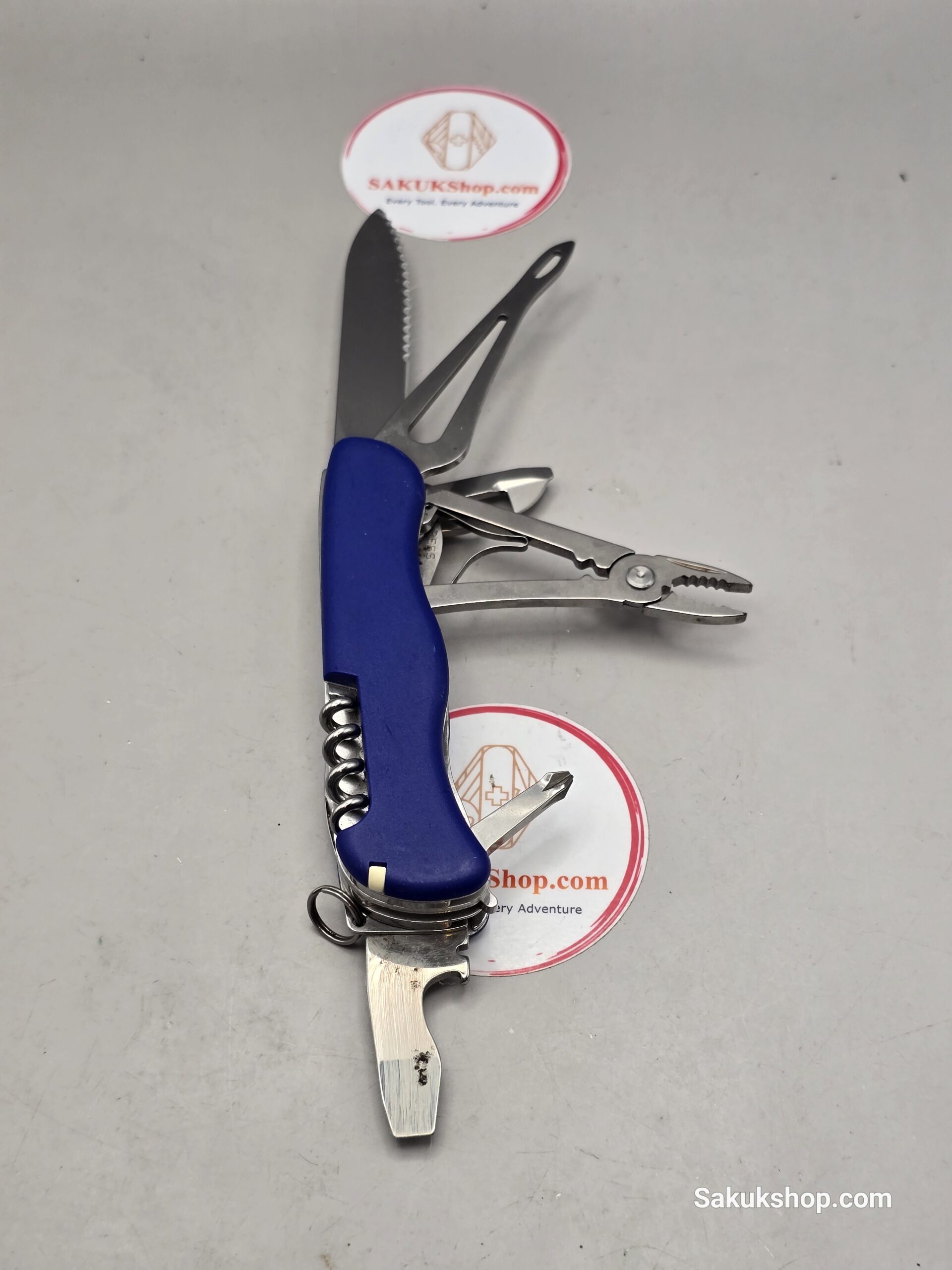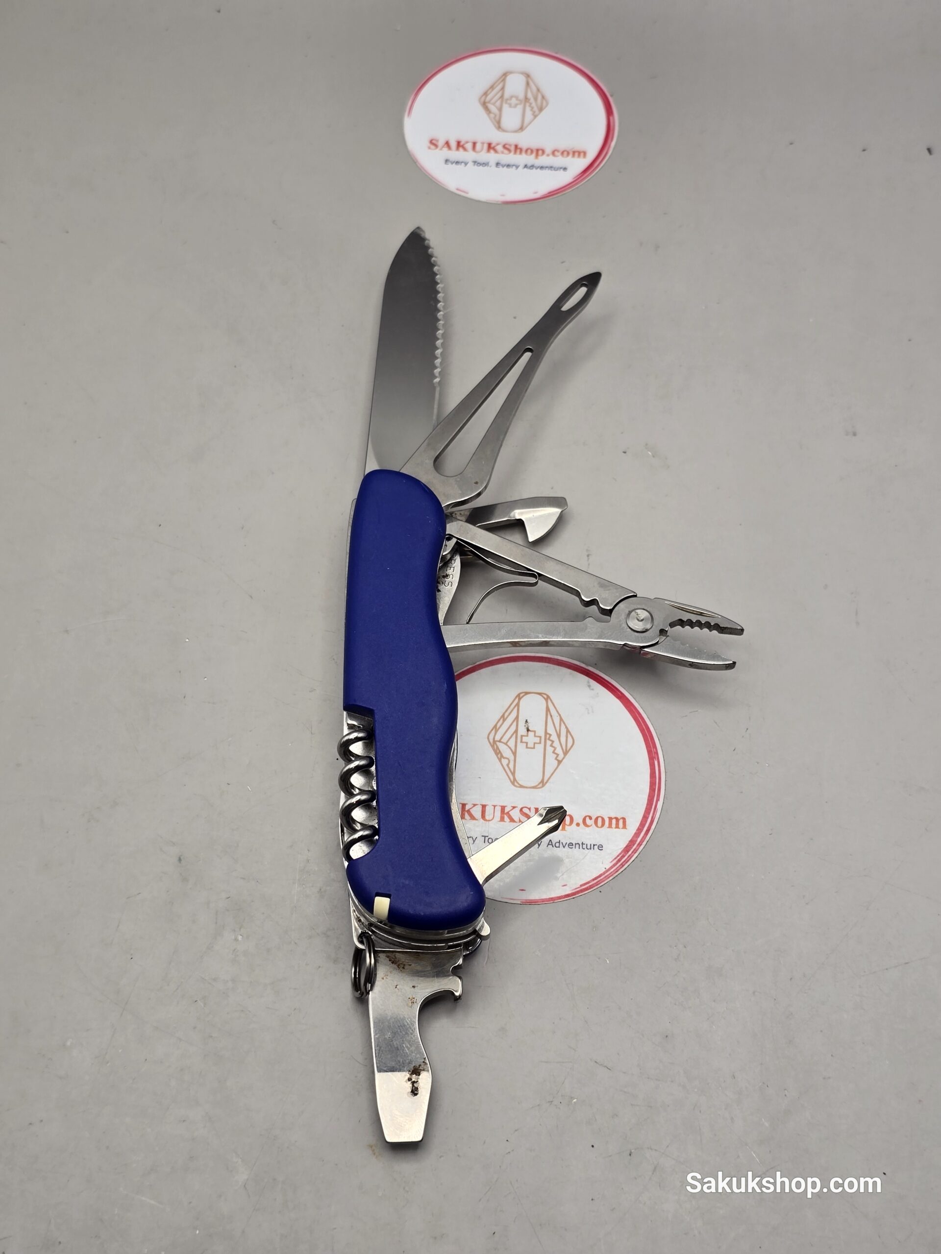 Blade, large with wavy edge / Corkscrew / Can opener | Screwdriver 3 mm / Bottle opener, lockable | Screwdriver 7 mm | Wire stripper / Reamer, punch / Phillips screwdriver 1/2 / Combination pliers | Wire cutters | Wire crimper / Shackle opener | Marlin spike / Key ring / Tweezers / Toothpick / Lanyard / Bottle opener, lockable / Shackle opener / Can opener / Combination pliers