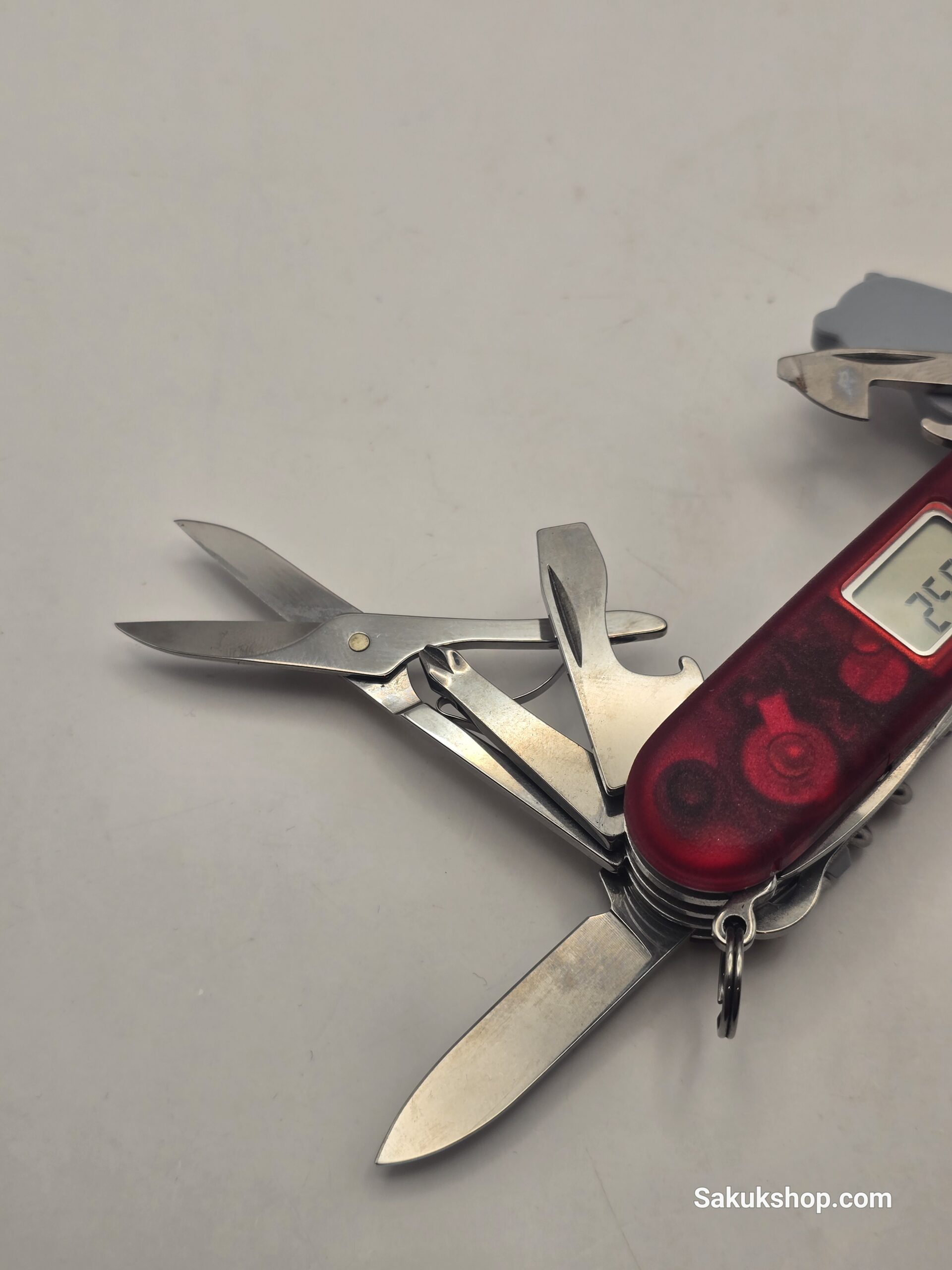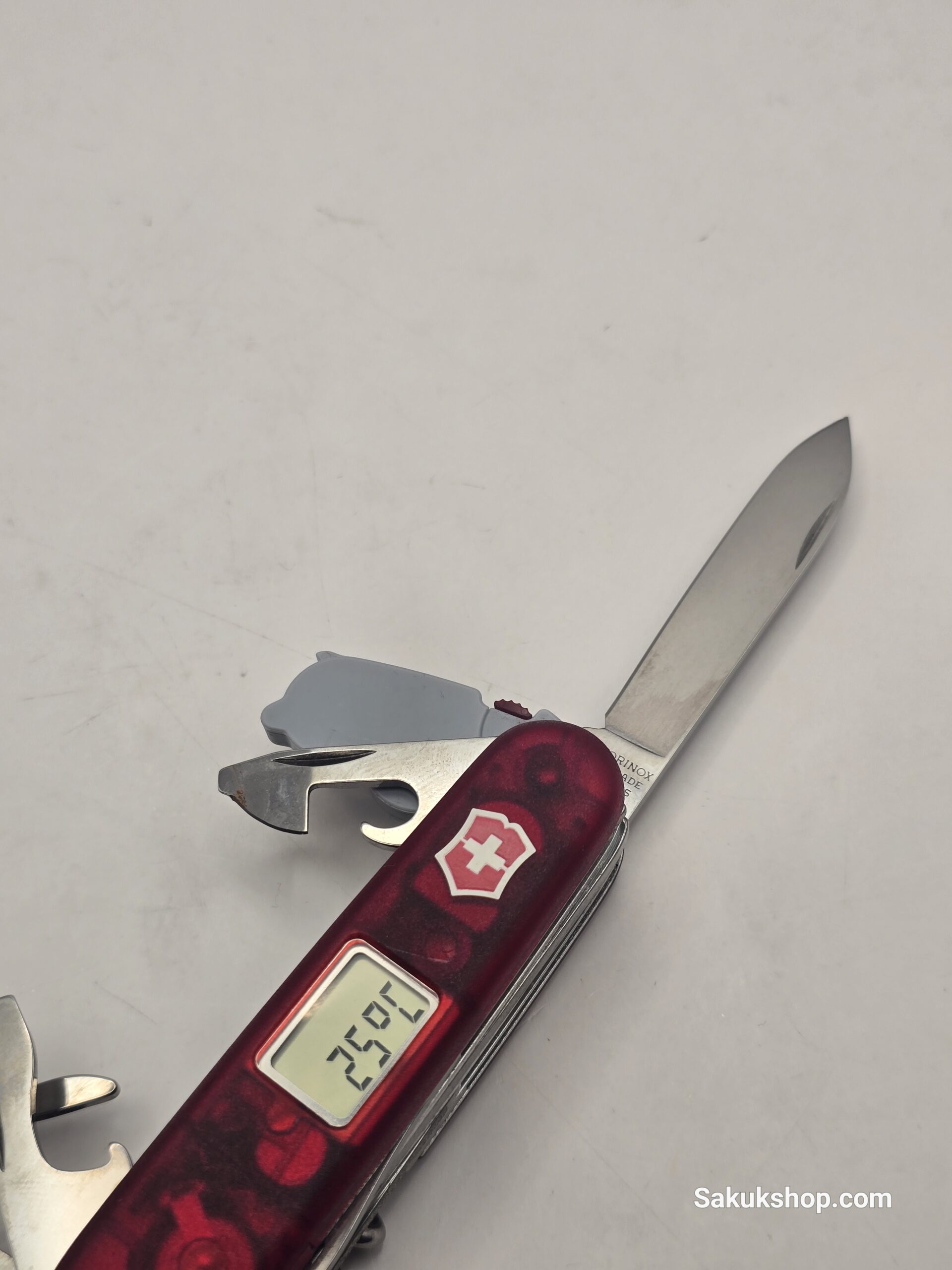 Digital Display: Features a digital display on the handle (controlled by the Victorinox shield button) that shows time (12/24h), altitude (meters/feet), barometer, thermometer, alarm, countdown, and stopwatch.