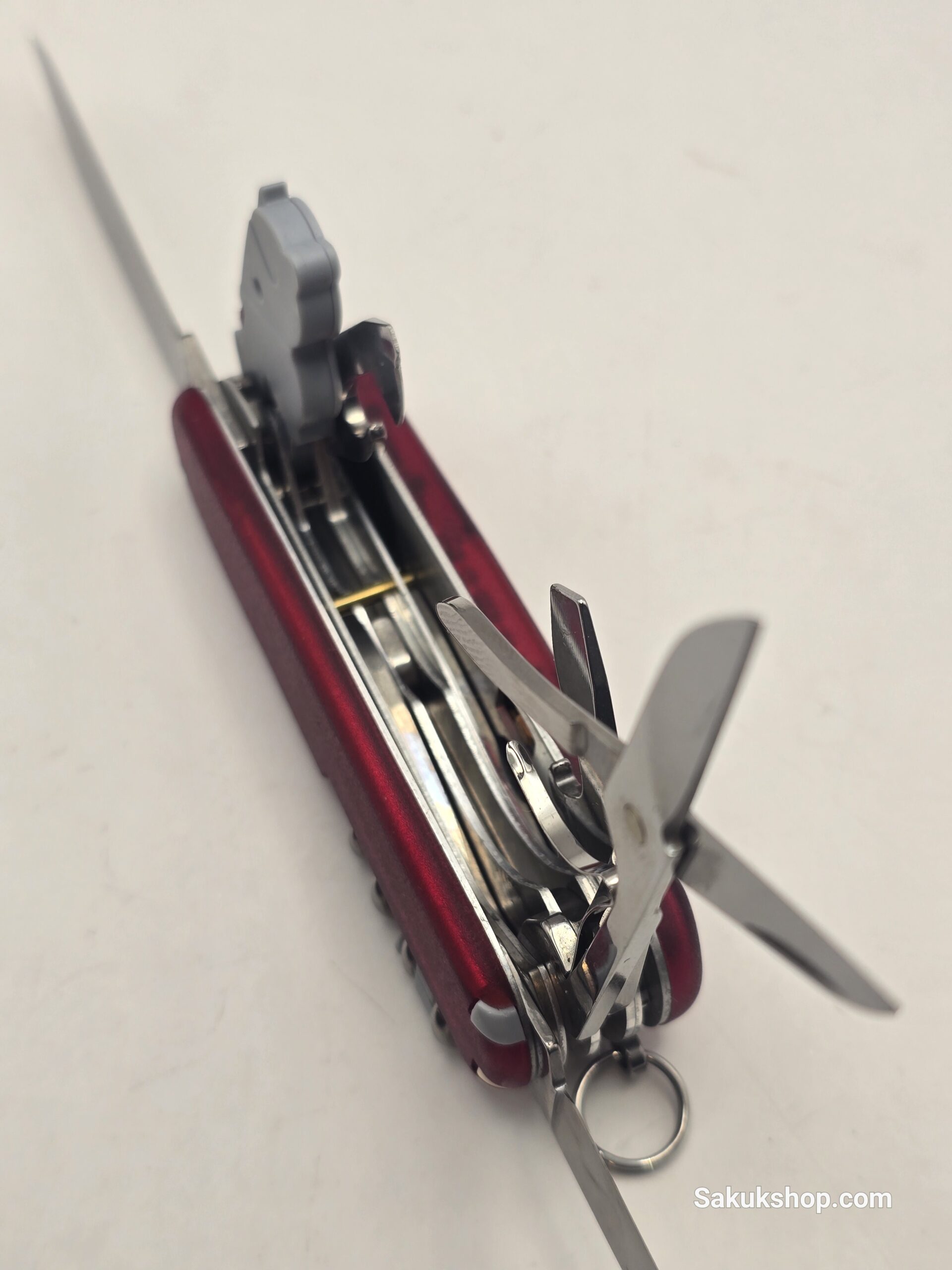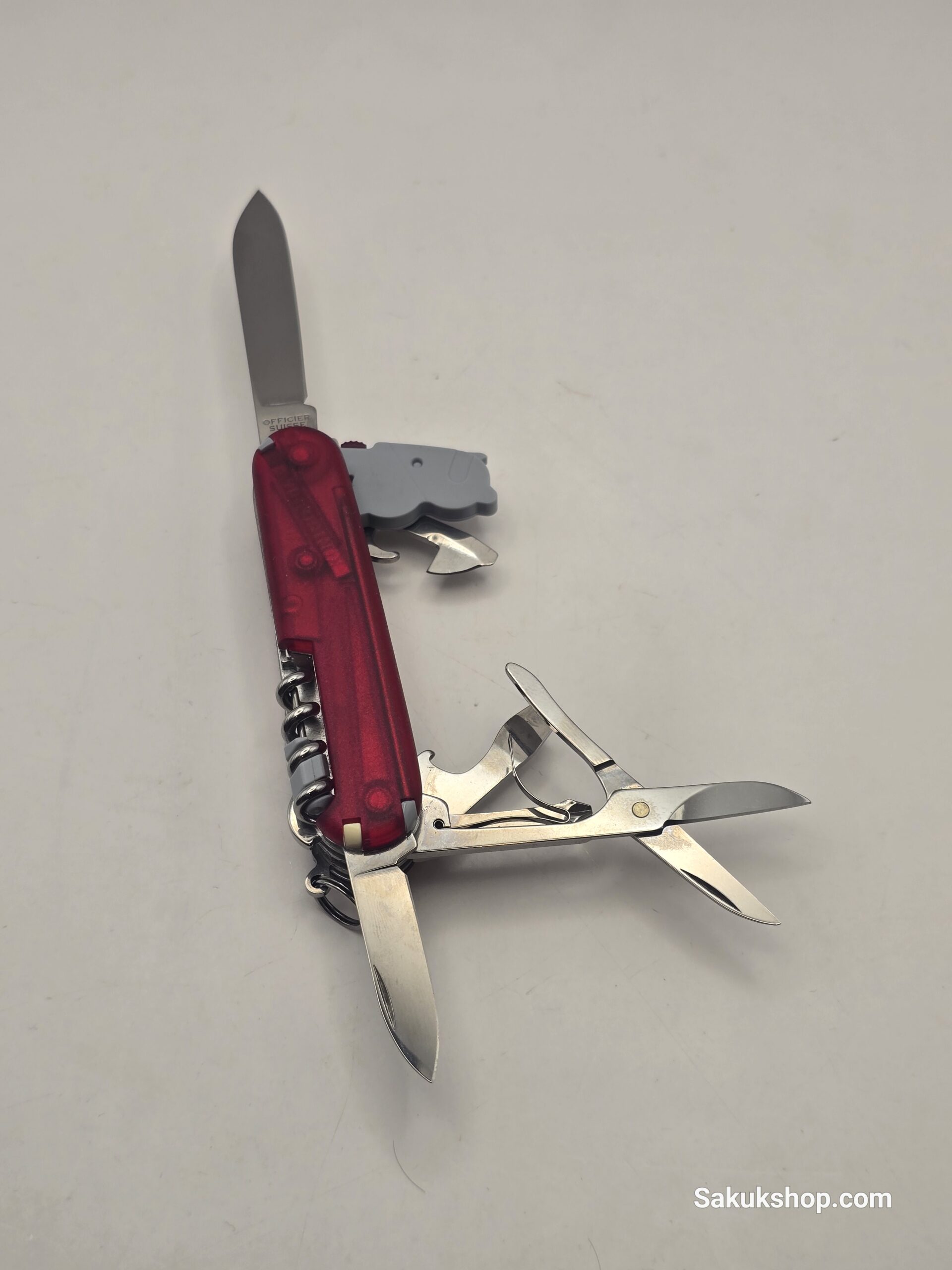 Essential Tools: Features a large blade, small blade, scissors, corkscrew, multi-purpose hook, inline Phillips screwdriver, can opener with small screwdriver, and a bottle opener with wire stripper.